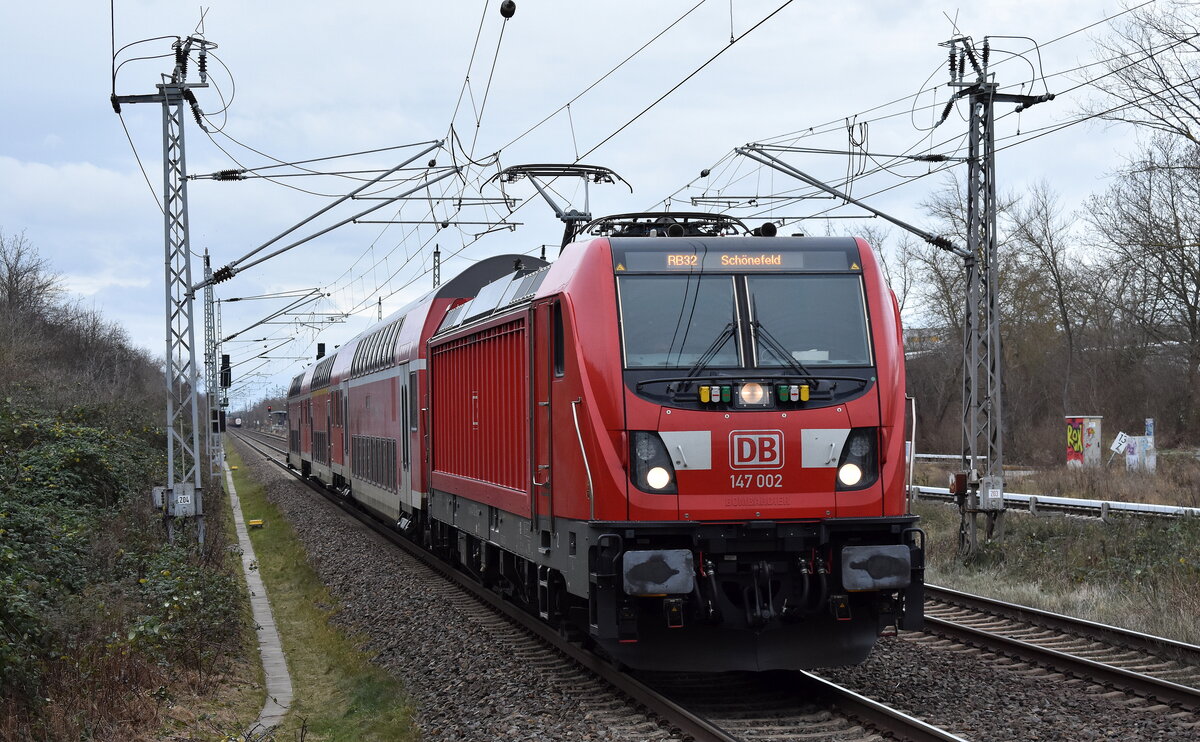 DB Regio AG - Region Nordost mit dem RB 32 Richtung Schönefeld (b. Berlin) mit  147 002  [NVR-Nummer: 91 80 6147 002-0 D-DB] bei der Einfahrt am 29.12.23 Bahnhof Berlin-Hohenschönhausen.