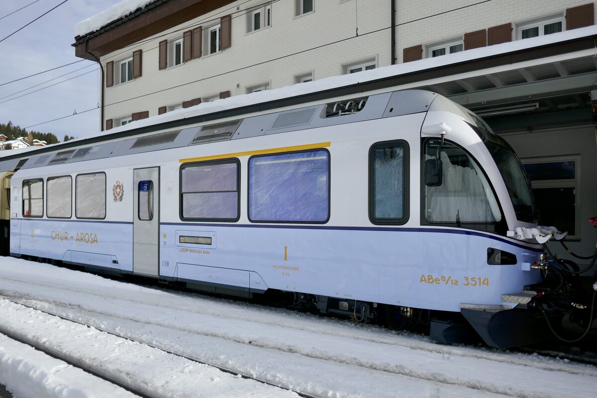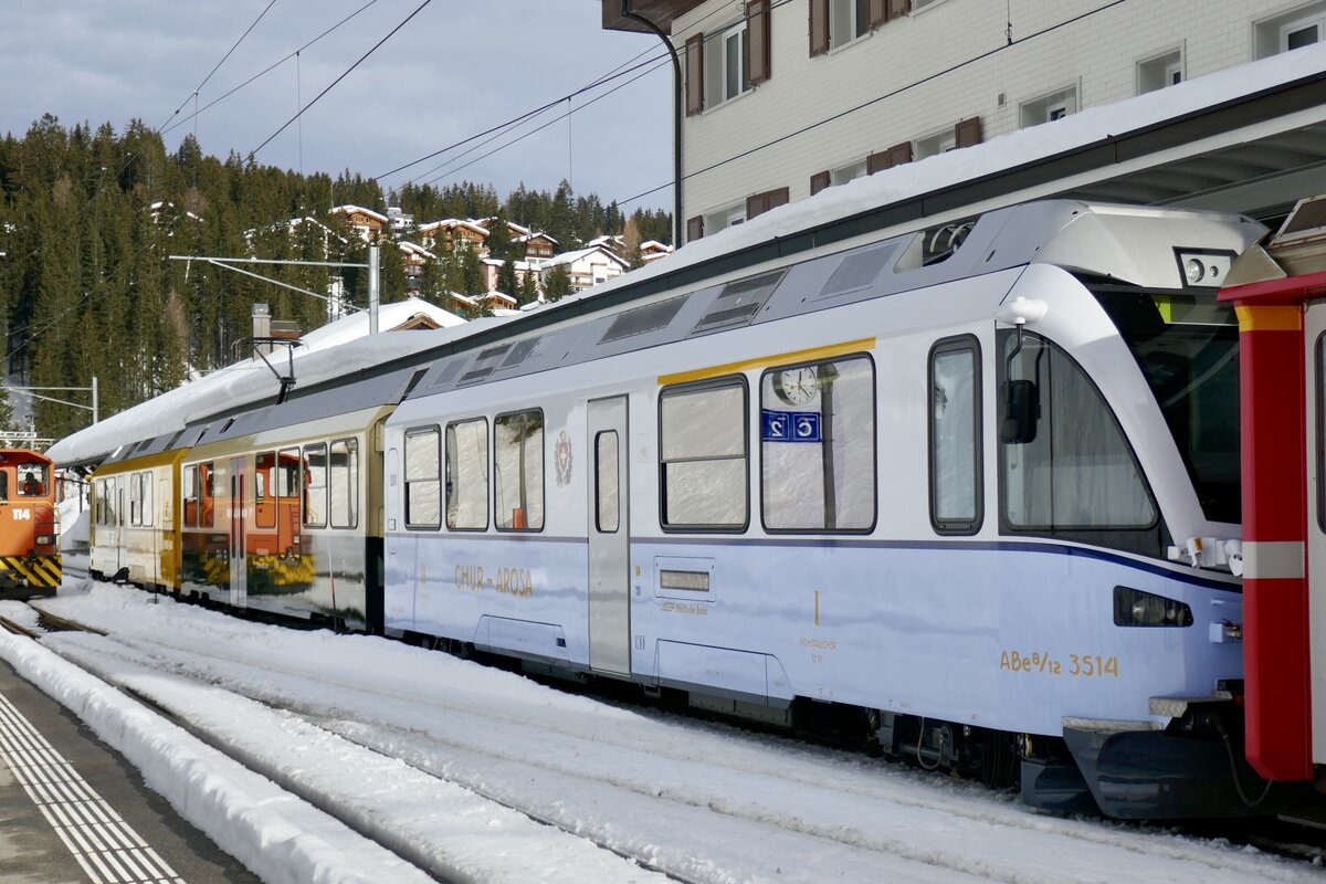 Der ABe 4/4 35114 vom  Ahnenzug  im Design der Arosabahn von vor der Fusion mit der RhB am 26.12.23 im Bahnhof Arosa.