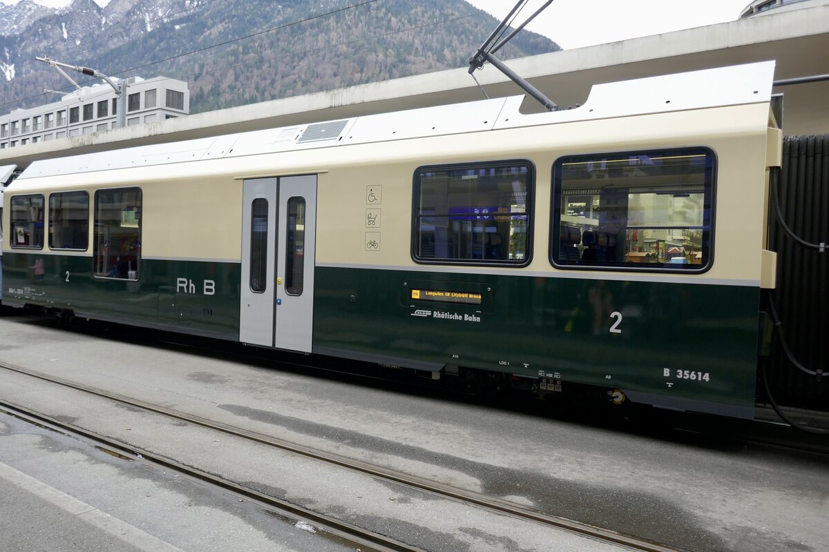 Der B 35614 im RhB Stammnetz-Design bevor man mit der Bernina- und Arosabahn Fusioniert hat am 26.12.23 im Bahnhof Arosa.