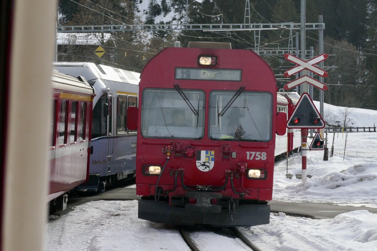 Der führende BDt 1758 des Regio nach Chur am 26.12.23 bei der Einfahrt in Langwies.