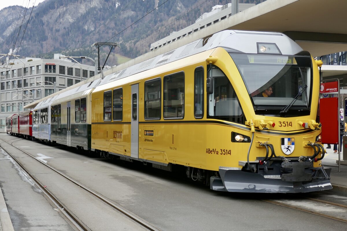 Frontansicht des ABe 8/12 3514  Ahnenzug  im gelben Berninabahn Design am 26.12.23 nach der Ankunft auf dem Bahnhofplatz Chur.