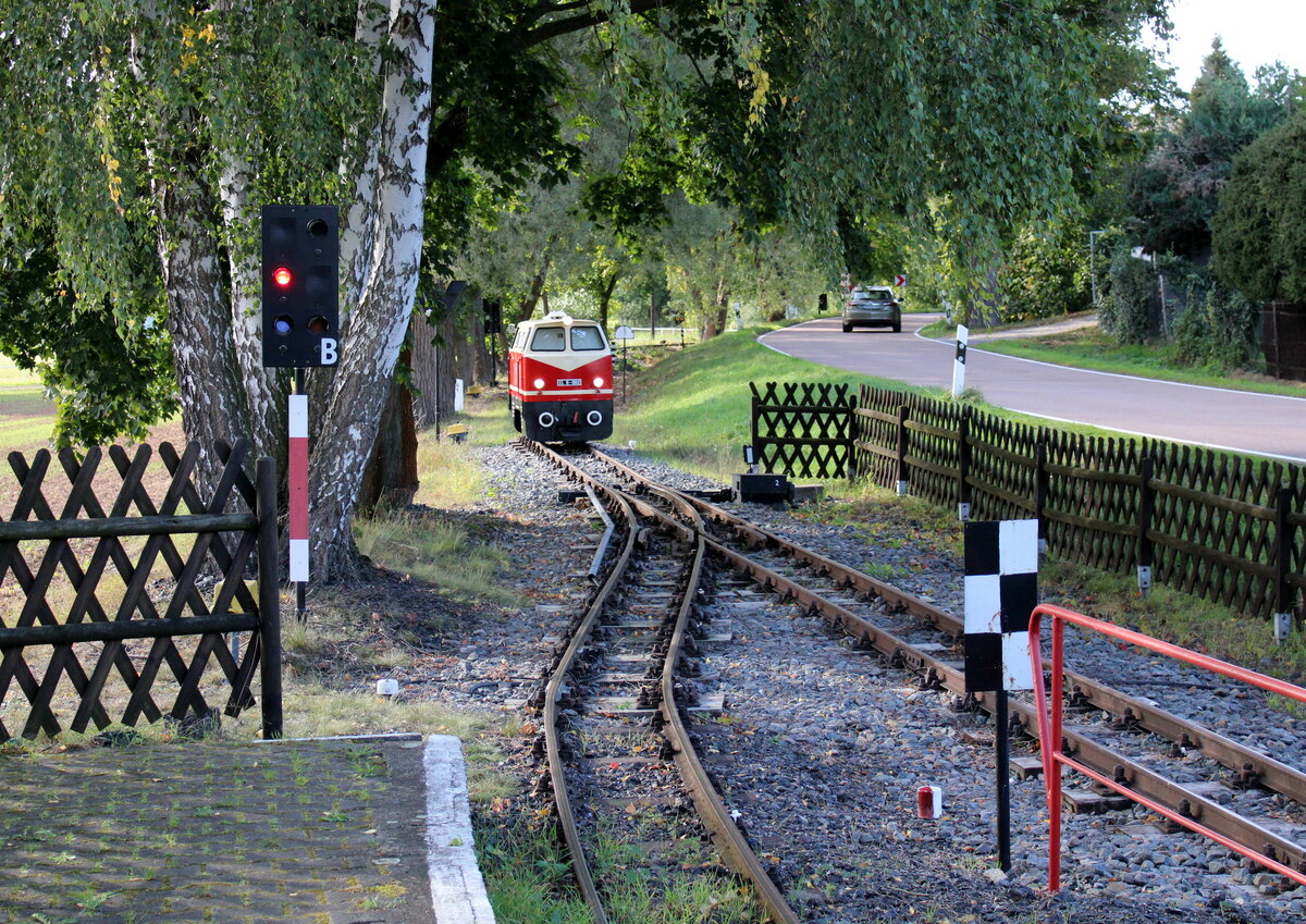 Dieses Bild zeigt die noch vorhandene WSSB in Güterglück. Die Straße führt weiter nach Töppel. Der RE13 kommt aus Richtung Zerbst.