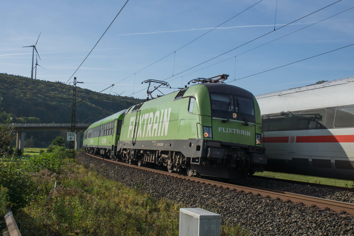 Zum Aufnahmezeitpunkt trug die 143 841 von DB Gebrauchtzug erst seit wenigen Wochen eine neue Lackierung. Das Design mit rotem Laufwerk, schwarzem Rahmen und grünem Lokkasten soll an die E-Loks der Deutschen Reichsbahn aus den 1960er Jahren erinnern. Am 25. September 2023 verschlug es die Lok, die zu Staatsbahnzeiten ausschließlich in Ostdeutschland unterwegs war, bis nach Bayern. Gemeinsam mit 143 138 (ebenfalls DB Gebrauchtzug) wurde für das Unternehmen SKL der leere Autotransportzug DGS 69217 von Saal an der Donau nach Bebra befördert. Am Esslinger Tunnel im schönen Altmühltal konnte ich die Leistung fotografieren.