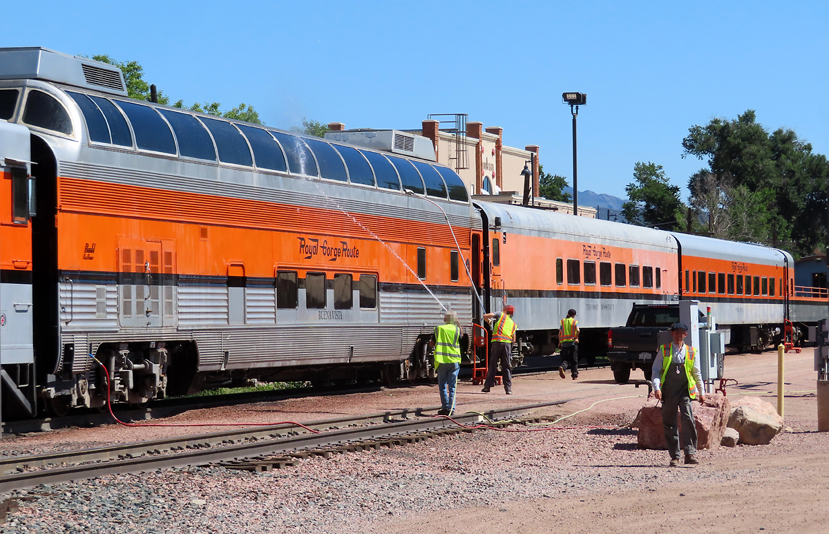 Der Touristenzug mit seinen vielen Aussichtswagen wird in Cañon City für die Fahrt in die Royal Gorge Schlucht bereit gemacht. Das Foto wurde von einem Bahnübergang aus gemacht. Cañon City, 29.8.2022