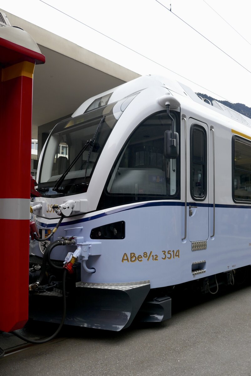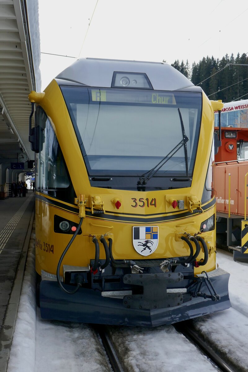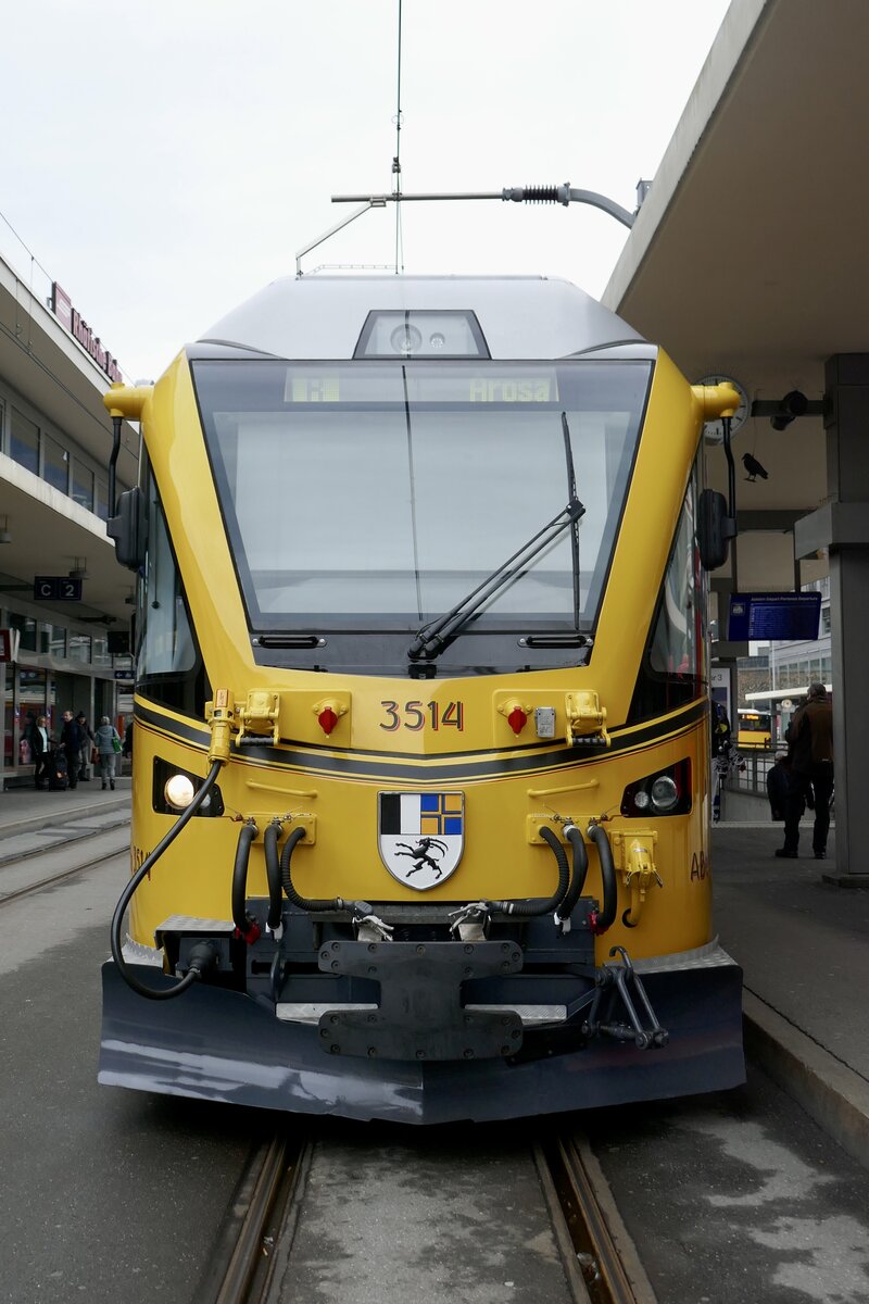 Frontansicht des ABe 8/12 3514  Ahnenzug  mit dem Arosabahn Design am 26.12.23 auf dem Bahnhofplatz Chur.