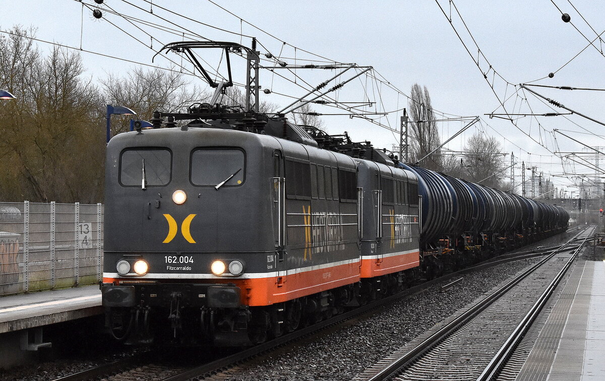 Hector Rail (Germany) GmbH, Bochum mit ihrer  162.004  Name:  Fitzcarraldo  (NVR:  91 80 6151 057-7 D-HRDE ) mit  162.001  Name:  Mabuse  (NVR:  91 80 6151 013-0 D-HRDE ) und einem Kesselwagenzug (leer) Richtung Stendell am 29.12.23 Durchfahrt Bahnhof Berlin-Hohenschönhausen.