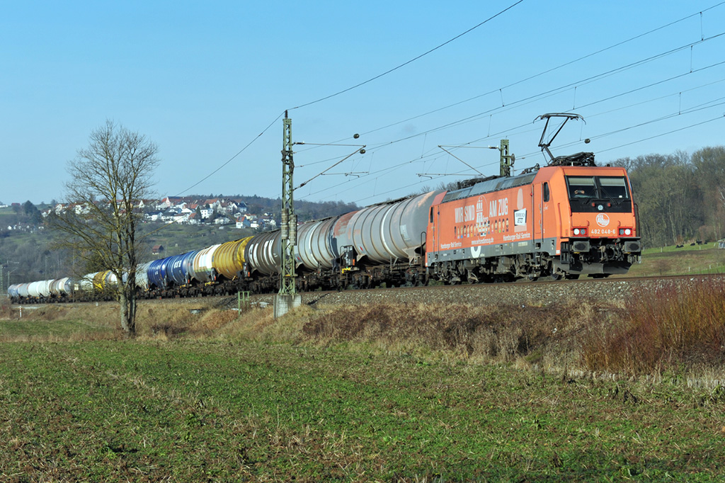 Während etwas weiter nördlich die ganze Zeit die Sonne schien, musste am Fotostandort bei Spergau in Kauf genommen werden, dass dieser Kesselzug Richtung Großkorbetha mit 152 120-2 (Siemens ES64F) und einige weitere Züge unter grauen Wolken vorbeifahren.