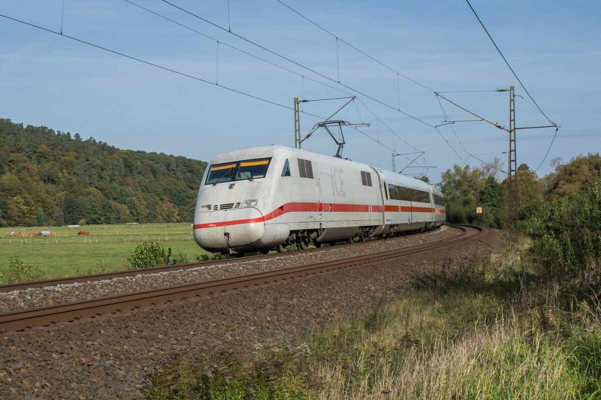 DB 101 083-4 fährt mit dem IC 2085 "Nebelhorn" (Hamburg-Altona - Oberstdorf) und dem IC 2083 "Königsee" (Hamburg-Altona - Berchtesgarden) bei Uffenheim in Richtung Ansbach. (20.06.2023)