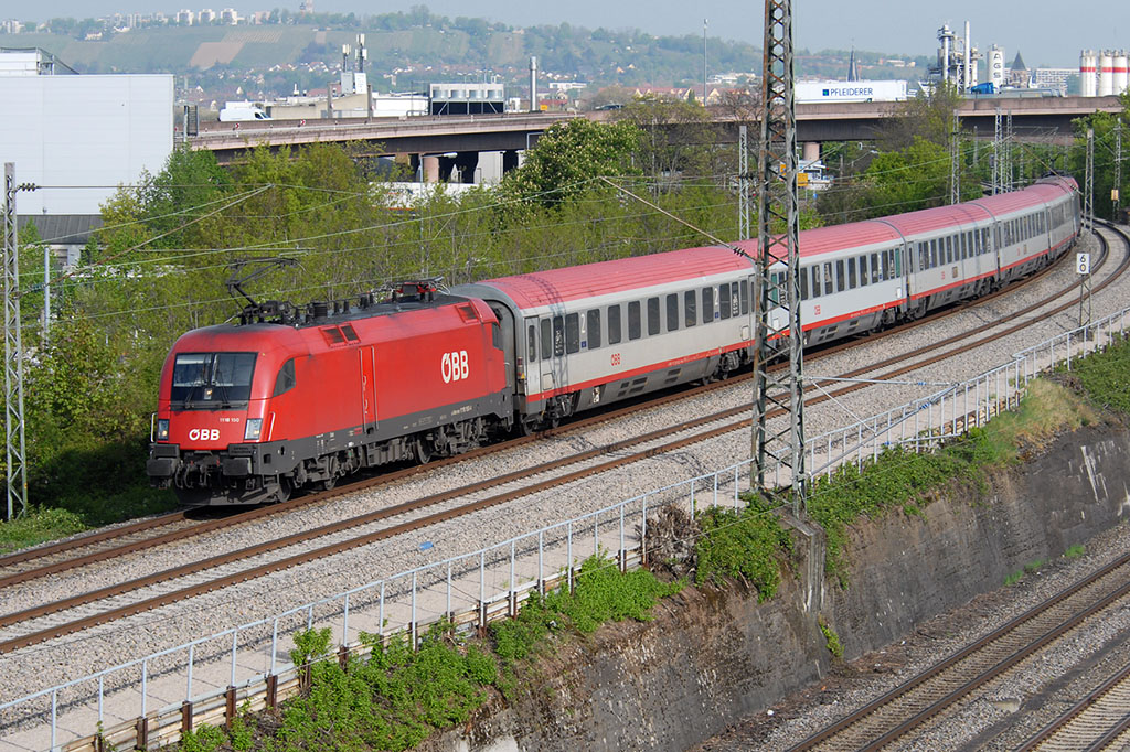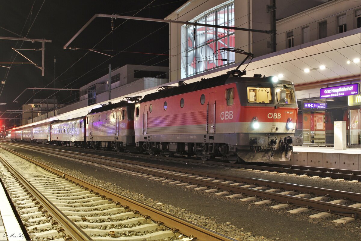 In der Nacht von 20. auf 21.12.2023 bespannte die 1144 288 den aus einem CityShuttle Steuerwagen und vier Schnellzugwagen bestehenden RJ853 von Wien Hbf nach Graz Hbf.