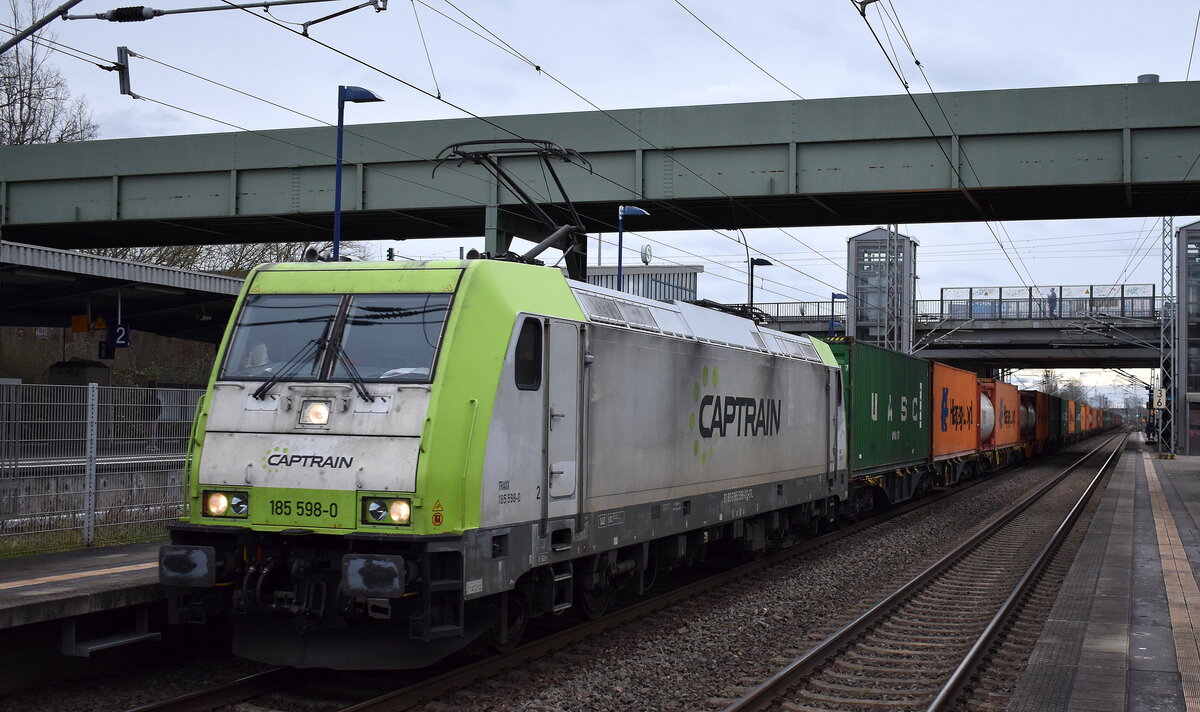 ITL - Eisenbahngesellschaft mbH, Dresden [D] mit der Akiem Lok "185 598-0" [NVR-Nummer: 91 80 6185 598-0 D-ITL] und einem Containerzug Richtung Hamburg am 29.12.23 Durchfahrt Bahnhof Berlin-Hohenschönhausen.
