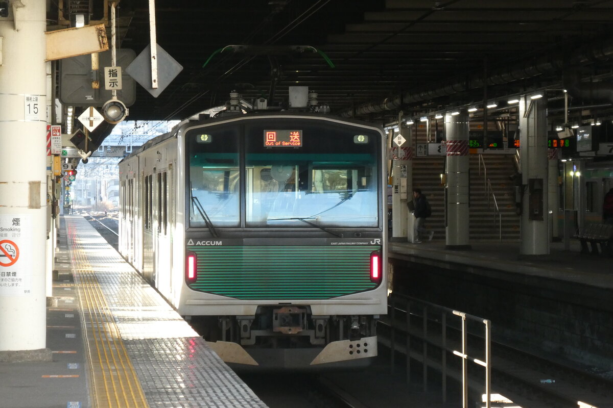 JR Akkutriebwagen Serie EV-E301 für Nahverkehrszug auf der Karasuyama Linie, In Utsunomiya Bahnhof, Am 27,12,2023.