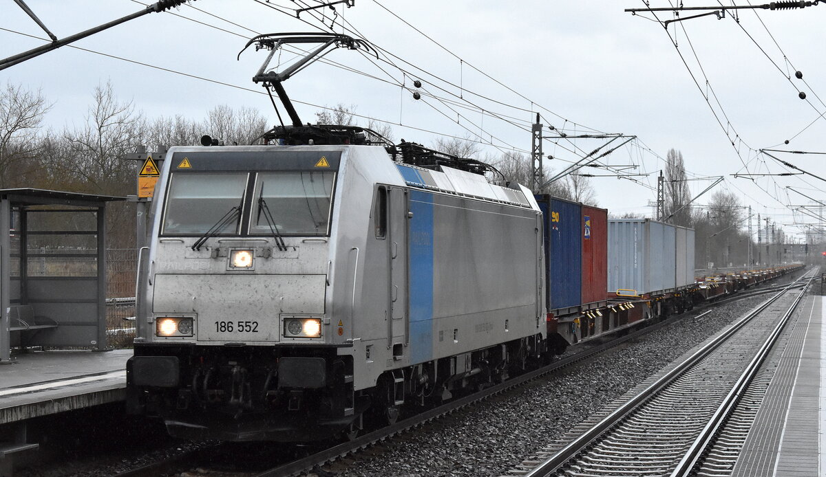 METRANS Rail s.r.o., Praha [CZ]  mit der Railpool Lok  186 552  [NVR-Nummer: 91 80 6186 552-6 D-Rpool] und einem fast leeren Containerzug Richtung Hamburg am 29.12.23 Durchfahrt Bahnhof Berlin-Hohenschönhausen.