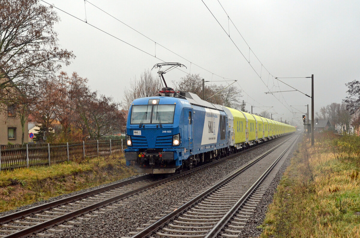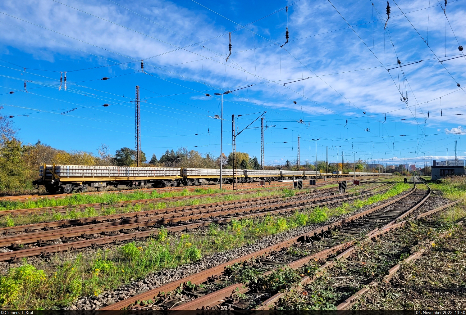 Ein Betonschwellenzug mit "Sgs"-Wagen und ohne Lok war überraschenderweise im Bahnhof Halle-Nietleben abgestellt und wurde hinter dem Zaun an der Heidestraße verbildlicht. 🧰 Schweerbau GmbH & Co. KG 🕓 4.11.2023 | 11:50 Uhr