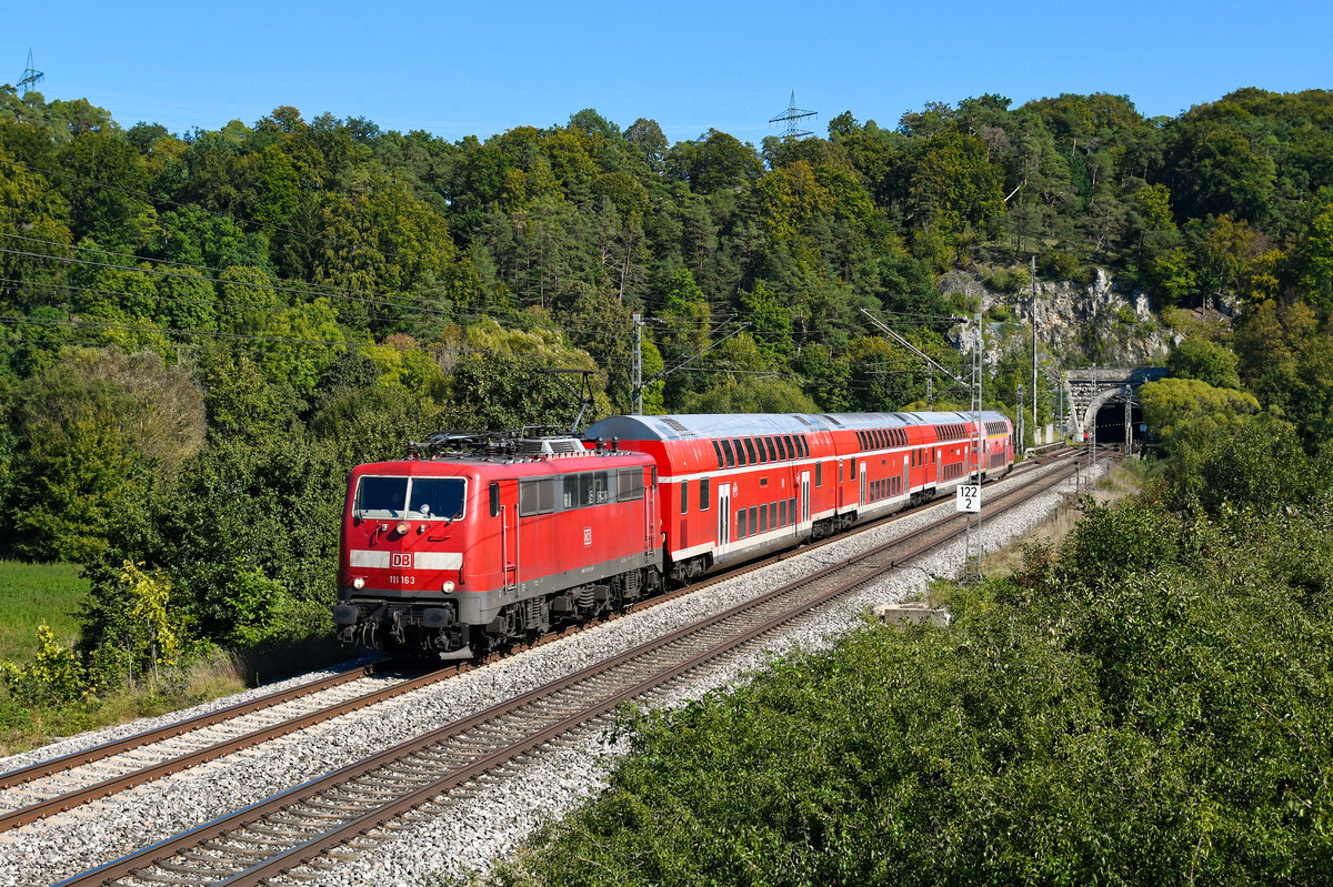 Nach wie vor unverzichtbar sind die Loks der Baureihe 111 bei DB Regio in Bayern. Allerdings ist der Bestand in München und Nürnberg auf inzwischen nur noch knapp über 20 Loks zusammengeschrumpft. Eine davon ist die optisch recht gepflegt wirkende 111 163. Sie war zuletzt lange Zeit in Stuttgart beheimatet und verstärkt seit Ende 2019 den Münchner Bestand. Am 25. September 2023 bespannte 111 163 die RB 59154 nach Nürnberg HBF. Der Zug verkehrte anstelle des planmäßigen Triebzug der Baureihe 445. Entstanden ist die Aufnahme bei Esslingen im Altmühltal, kurz nach Verlassen des gleichnamigen Tunnels.