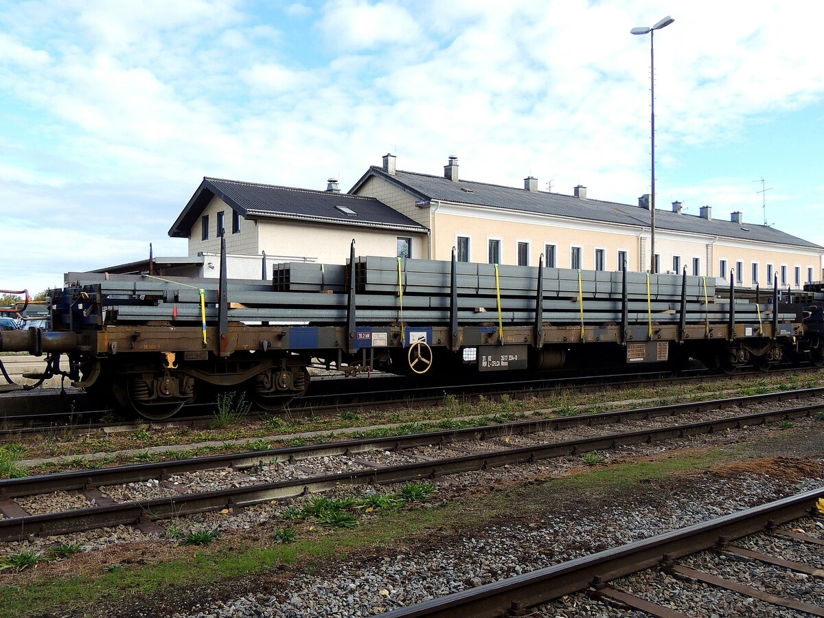 Rnss 31 82(L-CFLCA)3817 224-0 rollt mit Breitflanschträger beladen, durch den Bhf. Ried, in Richtung Stahlhändler bei Schärding; 231106