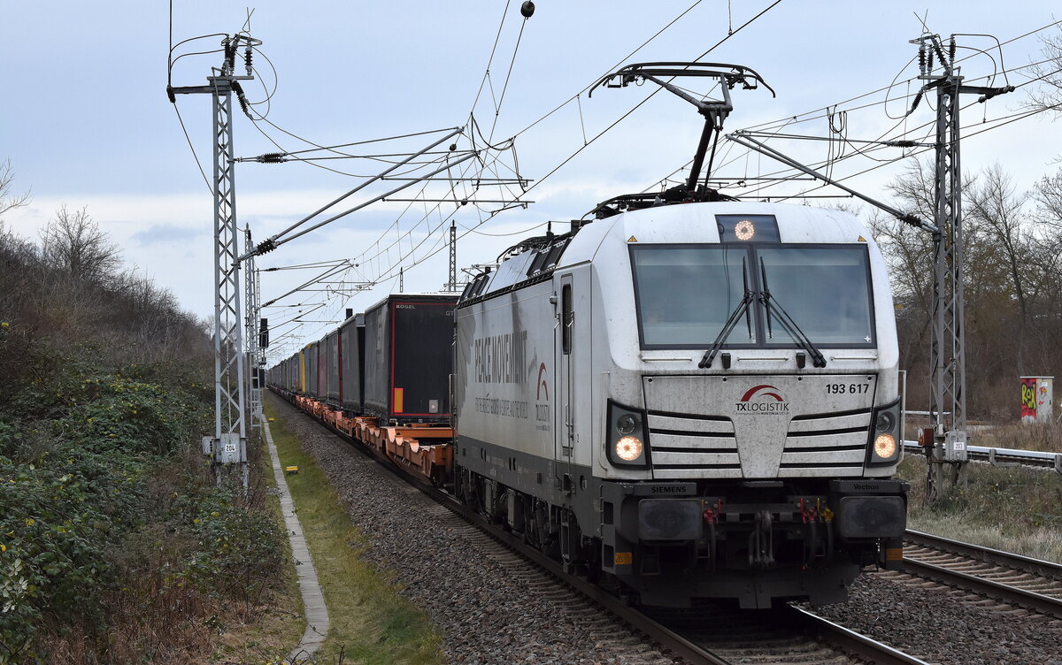 TX Logistik AG, Troisdorf [D] mit der Vectron  193 617  [NVR-Nummer: 91 80 6193 617-8 D-SIEAG] und dem KLV-Zug aus Rostock Seehafen am 29.12.23 Durchfahrt Bahnhof Berlin-Hohenschönhausen.
