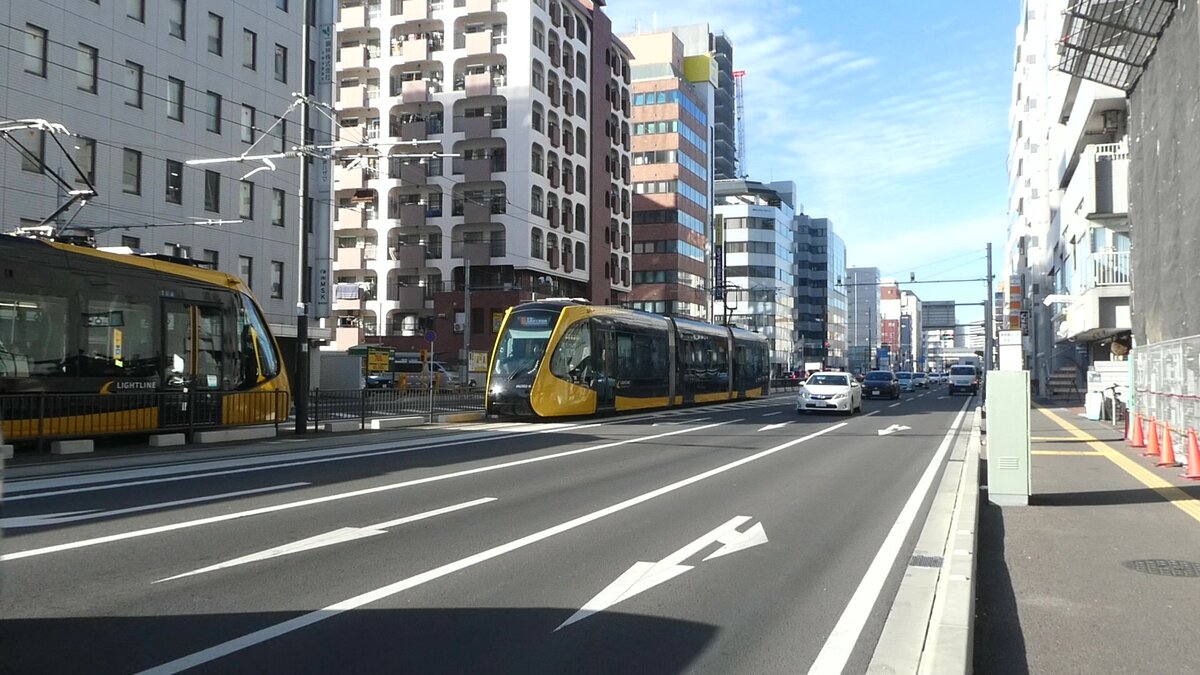 Utsunomiya Light Rail Serie HU300 in Kinu-Straße, Am 27.12.2023.