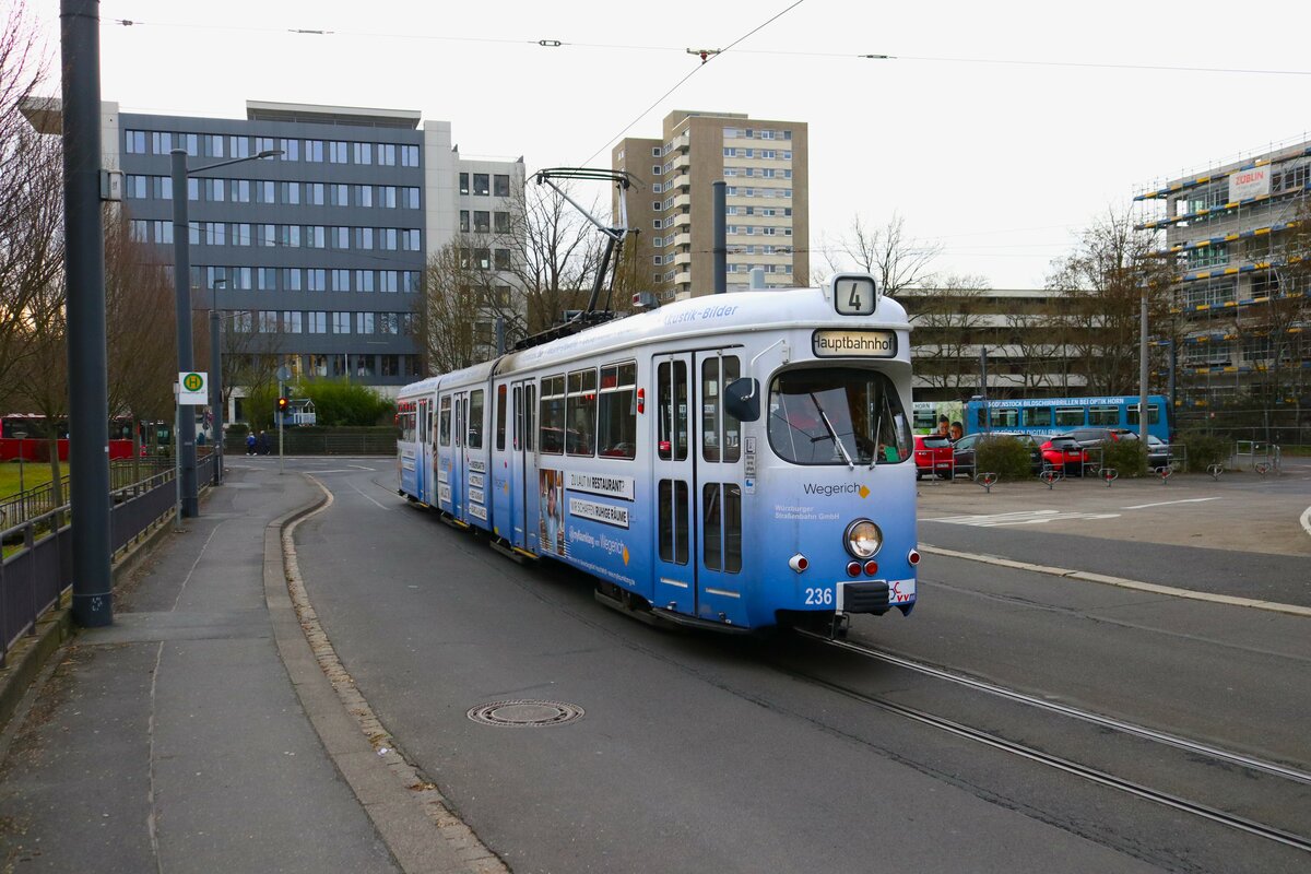 WVV Straßenbahn Würzburg Düwag GTW D8 Wagen 236 am 27.12.23 in Würzburg Hbf