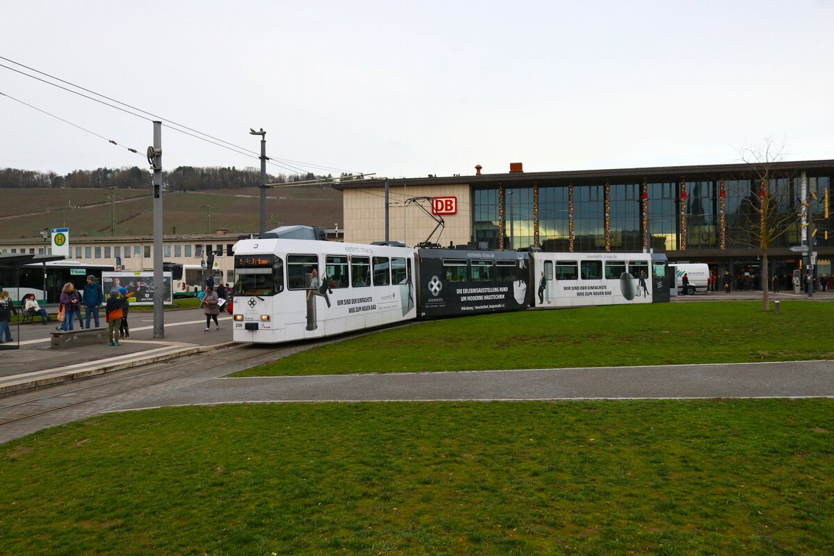 WVV Straßenbahn Würzburg LHB GT-E Wagen 208 am 27.12.23 in Würzburg Hbf