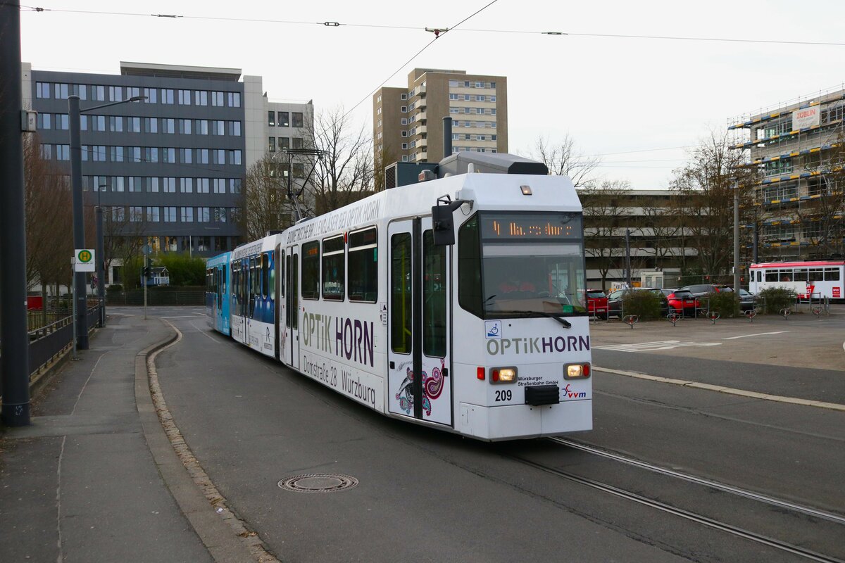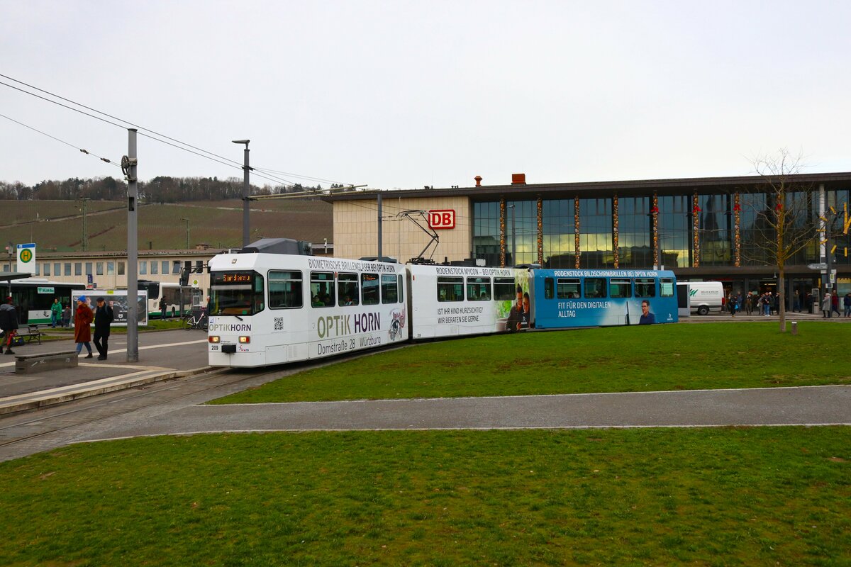 WVV Straßenbahn Würzburg LHB GT-E Wagen 209 am 27.12.23 in Würzburg Hbf