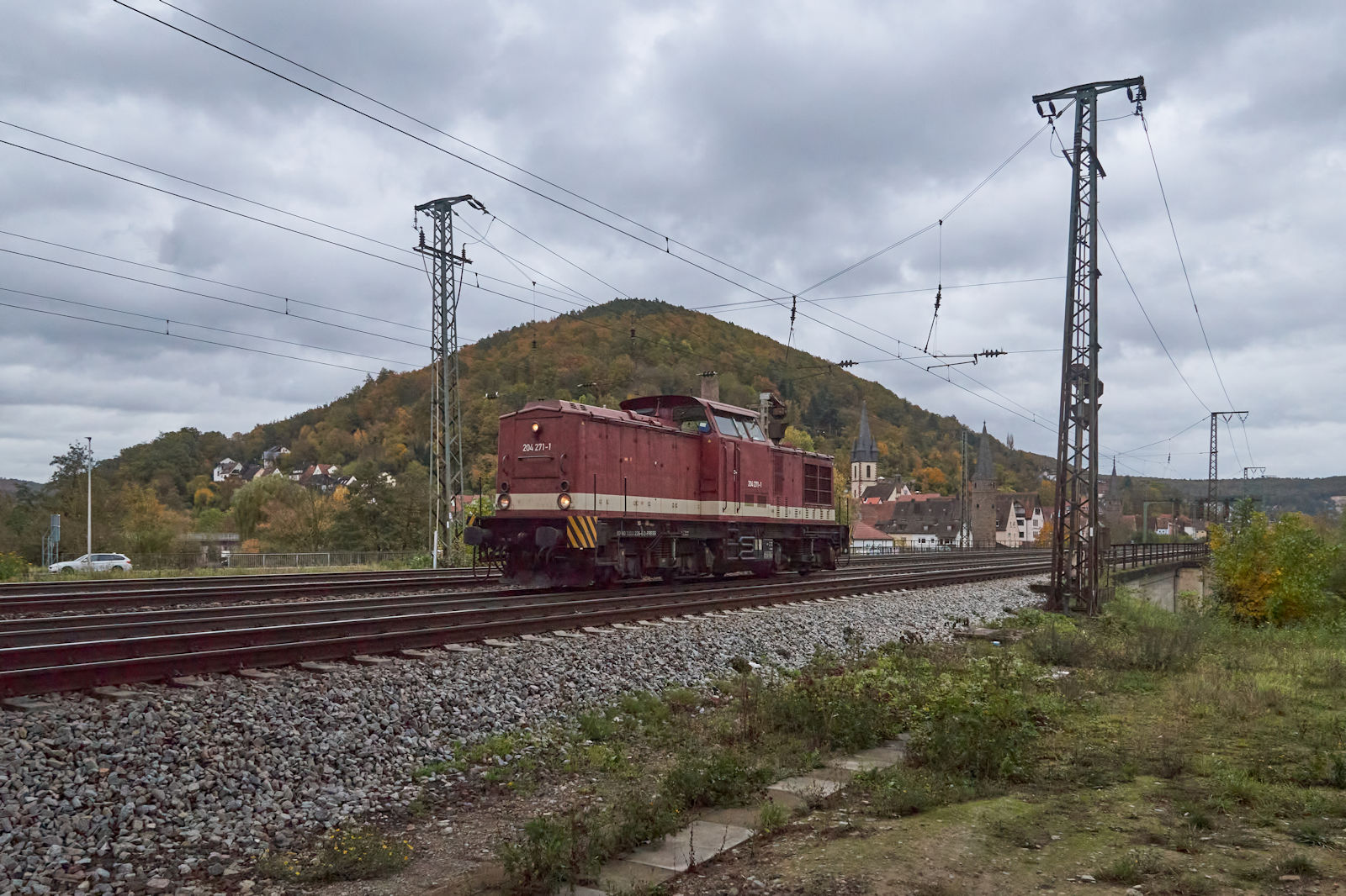 Da kommt die Zuglok für den Venice-Simplon-Orient-Express (VSOE) von Prag nach Paris in Gestalt von 232 571 am 21.10.2023 in Rupprechtstegen. Auf Grund der Achslast und aus Rücksicht auf manchen Überführungen musste die Ludmilla laut Aussagen eines getroffenen Hobbykollegen im Gegengleis fahren.