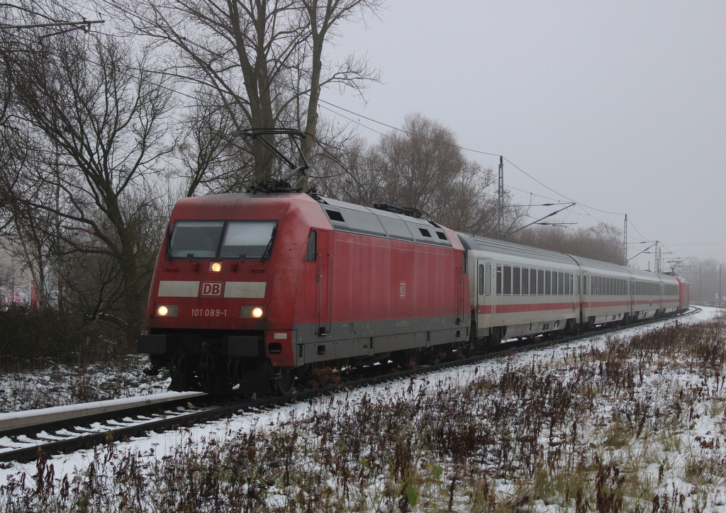 101 089+101 116(hinten) mit IC 2924(Dresden-Warnemünde)bei der Durchfahrt am 09.12.2023 in Rostock-Evershagen
