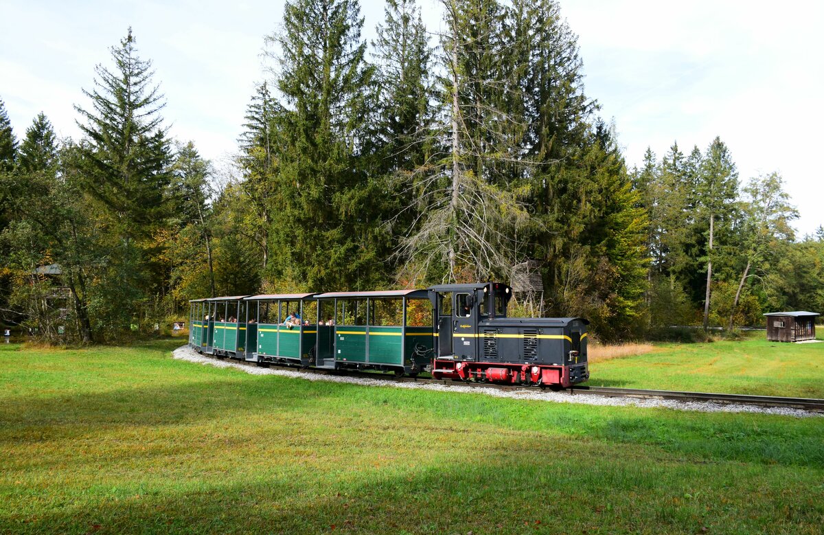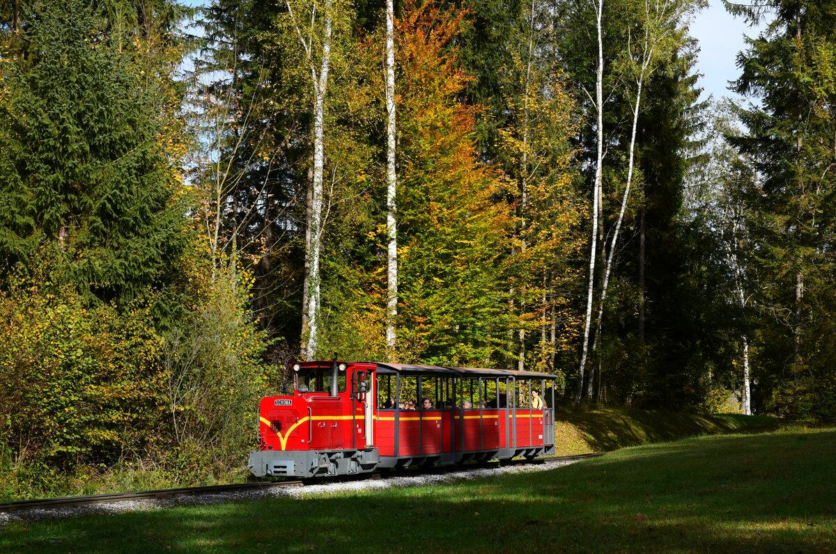 Das Salzburger Freilichtmuseum ist eine tolle Ausflugsmöglichkeit für Jung und Alt. Und auch für die Eisenbahnfans! :) Das Bild zeigt einen der Züge mit der roten Schöma Lokomotive Vf 2 "Untersberg". Großgmain, 29.10.2023.