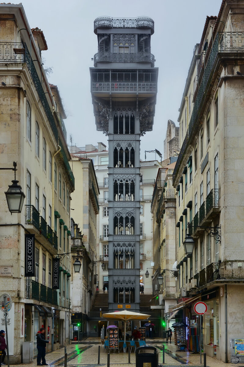 Blick von der oberen Station des höher gelegenen Stadtteiles Chiado auf den 1902 erbauten gusseiserne Elevador de Santa Justa. (Lissabon, Januar 2017)