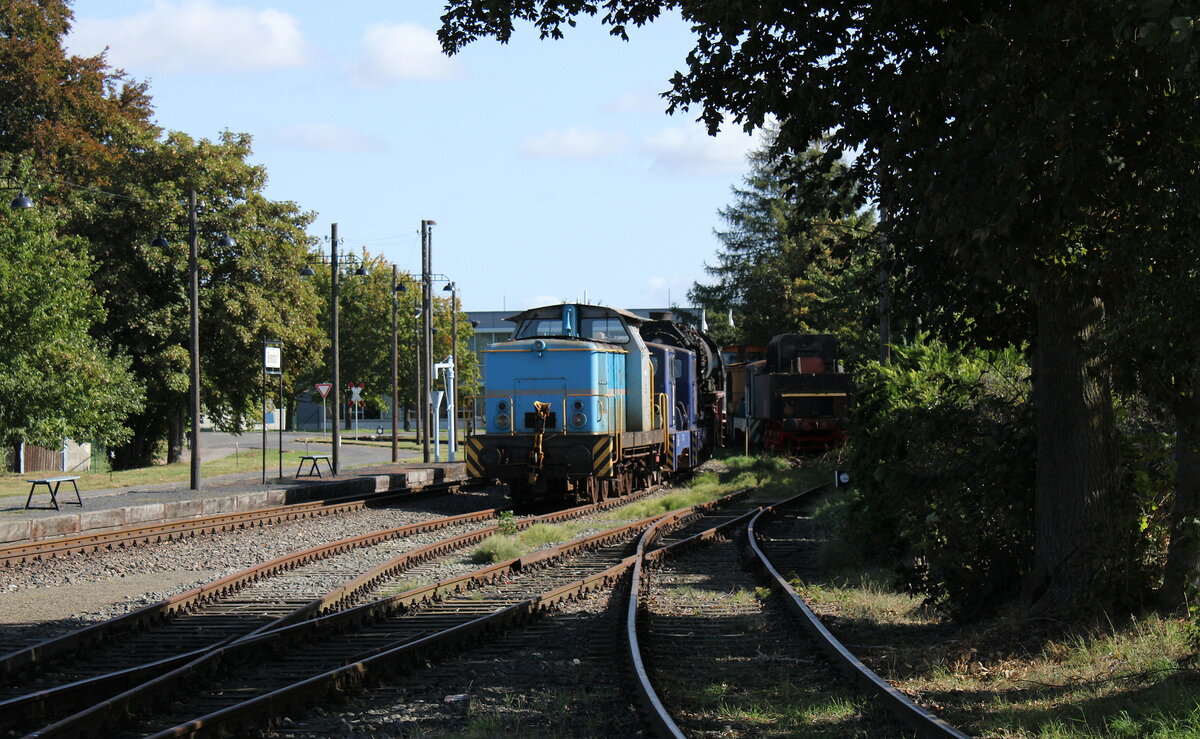 SDG 99 608 mit dem P 177 nach Benndorf, am 30.09.2023 in Hettstedt-Kupferkammerhütte. Zum historischen Eisenbahnwochenende war die sächs. IV K bei der Mansfelder Bergwerksbahn als Gastlok im Einsatz.