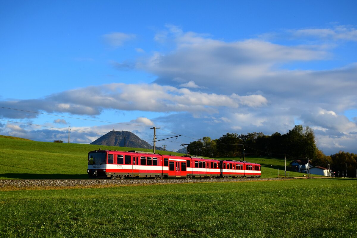 Die SLB Triebzug fährt von Salzburg Hbf. nach Oberndorf kurz nach Hst. Muntigl. Im Hintergrund ist der Berg Nockstein. 27.10.2023.