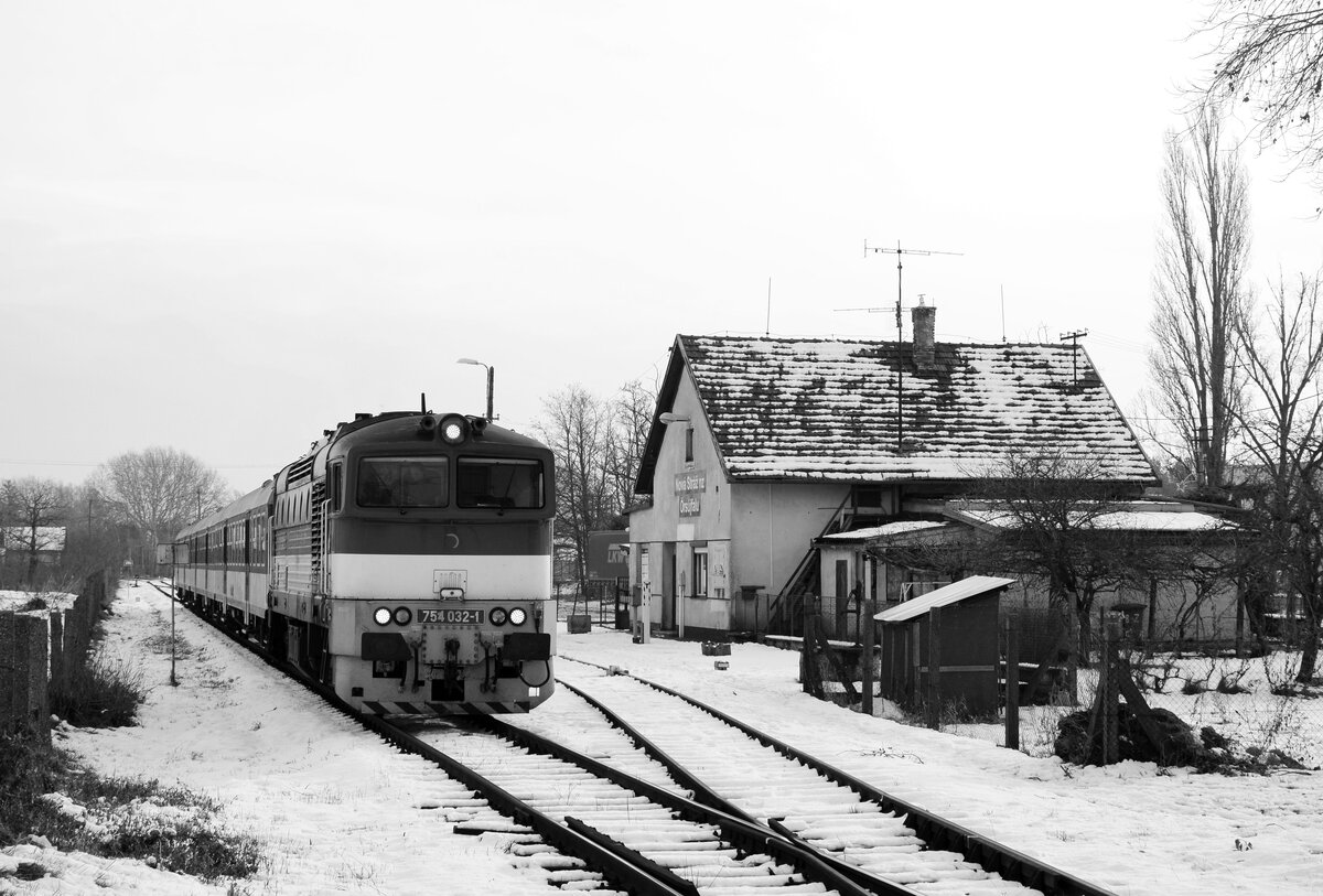 Das Bild zeigt den letzten Zug mit 754er. 754 032 - Os 4314, Örsújfalu (Nová Stráž).