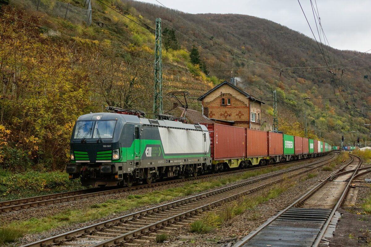 ELL 193 931 mit Containerzug in Kaub am Rhein, November 2023.