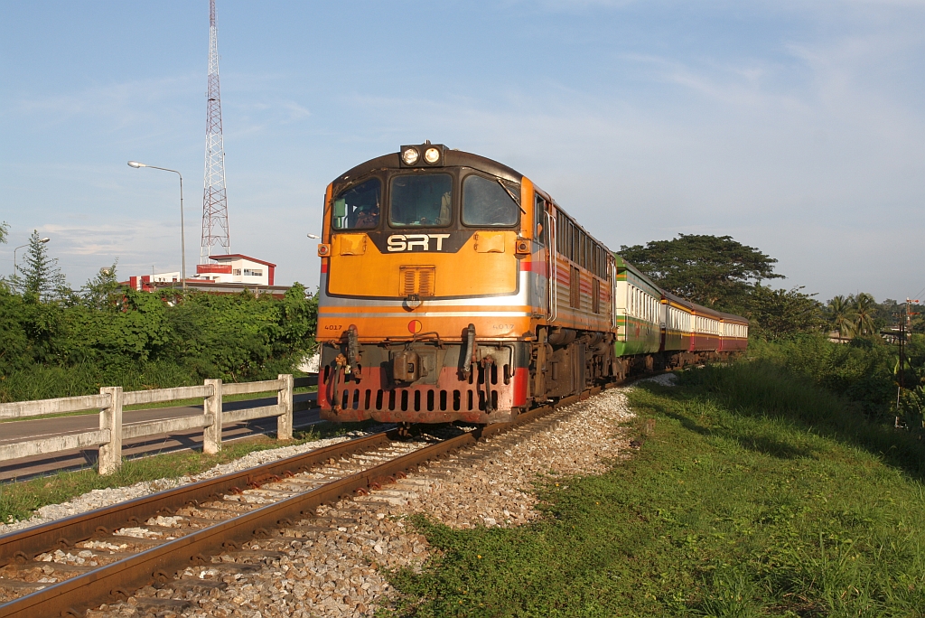 GEK 4017 (Co'Co', de, General Electric, Bj.1963, Fab.Nr. 34866) am 06.Dezember 2023 mit dem ORD 489 (Surat Thani - Khiri Ratthanikhom) kurz vor der Chulachomklao Bridge über den Tapi River in Surat Thani.