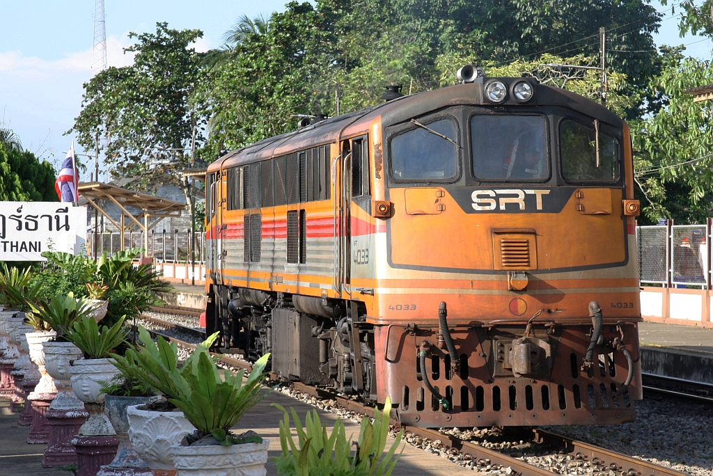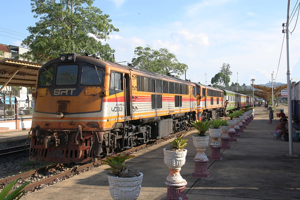 GEK 4033 (Co'Co', de, General Electric, Bj.1963, Fab.Nr. 34882) als Verschubreserve in der Surat Thani Station schiebt am 06.Dezember 2023 den, von der GEK 4017 gezogenen, ORD 489 nach Khiri Ratthanikhom an den Bahnsteig.