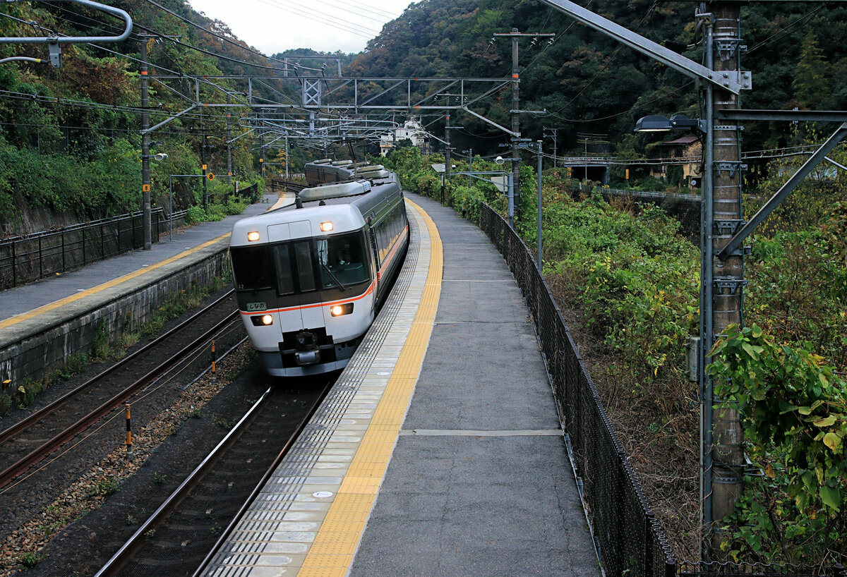 JR Tôkai (JR Central), Intercityzüge Serie 383 mit neigbarem Wagenkasten: Zug 383 Nr.2 kommt aus den Bergen herunter durch die Kokokei-Schlucht, zuvorderst das Zugsende mit Durchgangstüren. 6.November 2023