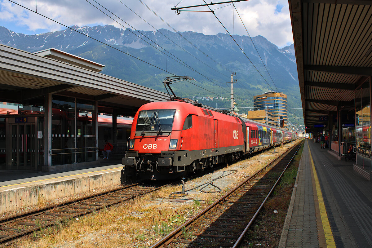 ÖBB 1116 168 steht mit dem ÖFB Railjet in Innsbruck Hbf. (10.06.2023)