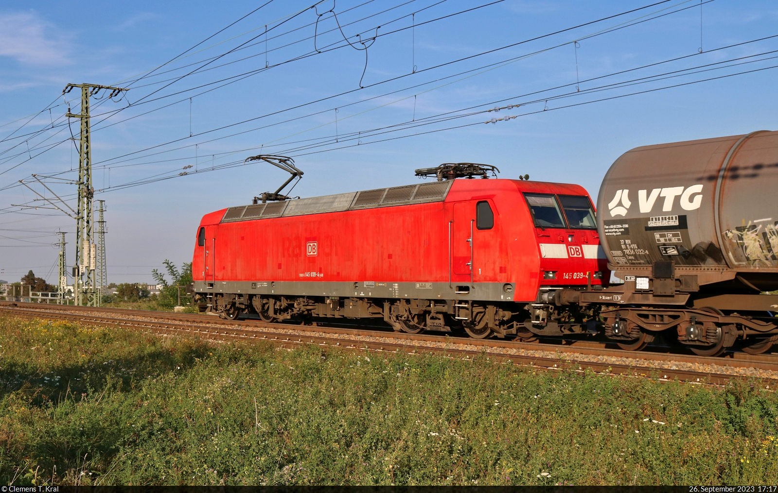 145 077-4 auf Solofahrt über die Leipziger Chaussee (B 6) Richtung Zugbildungsanlage (ZBA) Halle (Saale).
