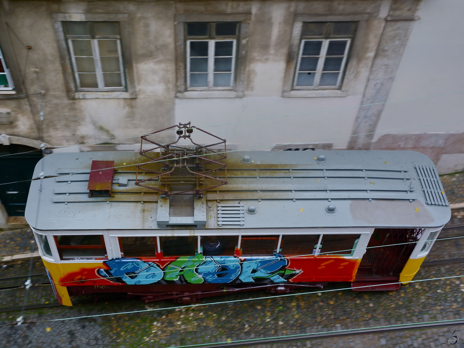 Einer der Wagen des 1885 eröffneten Ascensor da Glória fährt gerade zur Talstation. (Lissabon, Dezember 2016)
