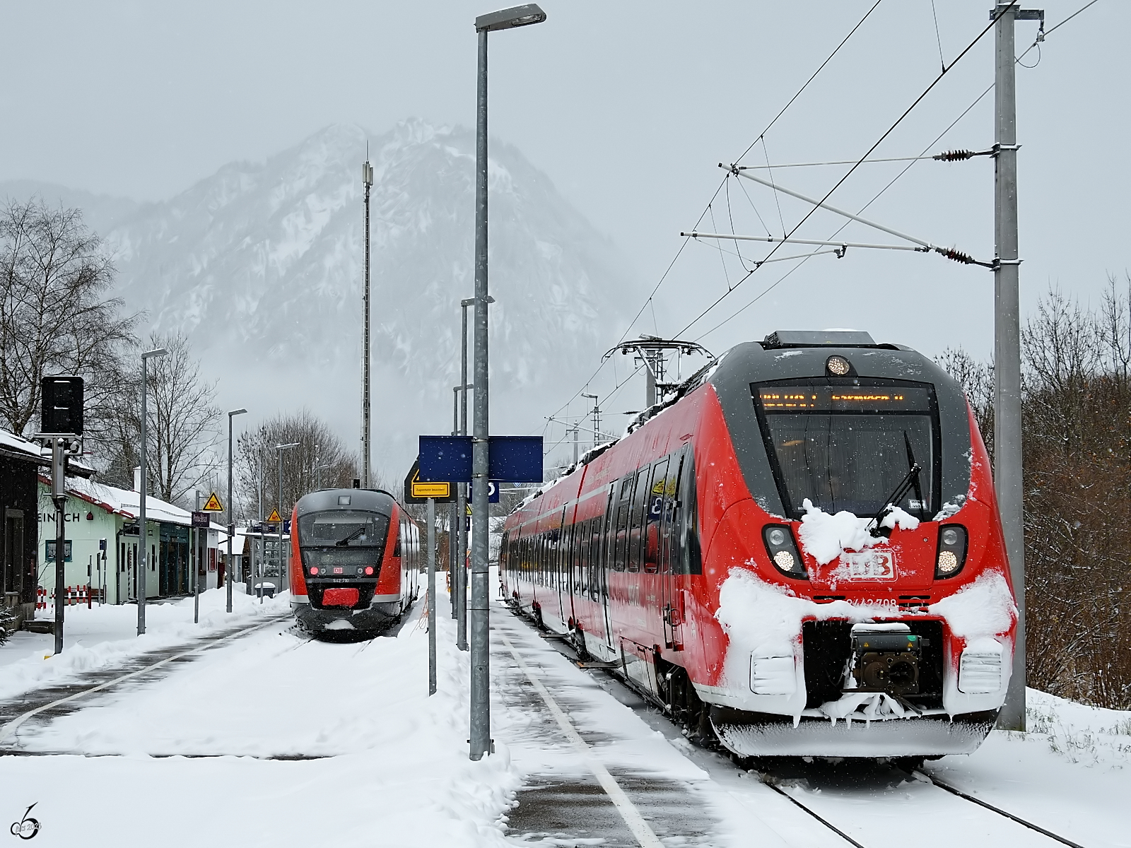 Ende November 2023 warteten am ehemaligen Bahnhof Pfronten-Steinach die Triebzüge 442 708 (als S7) und 642 710 (als RB73) auf die Weiterfahrt.