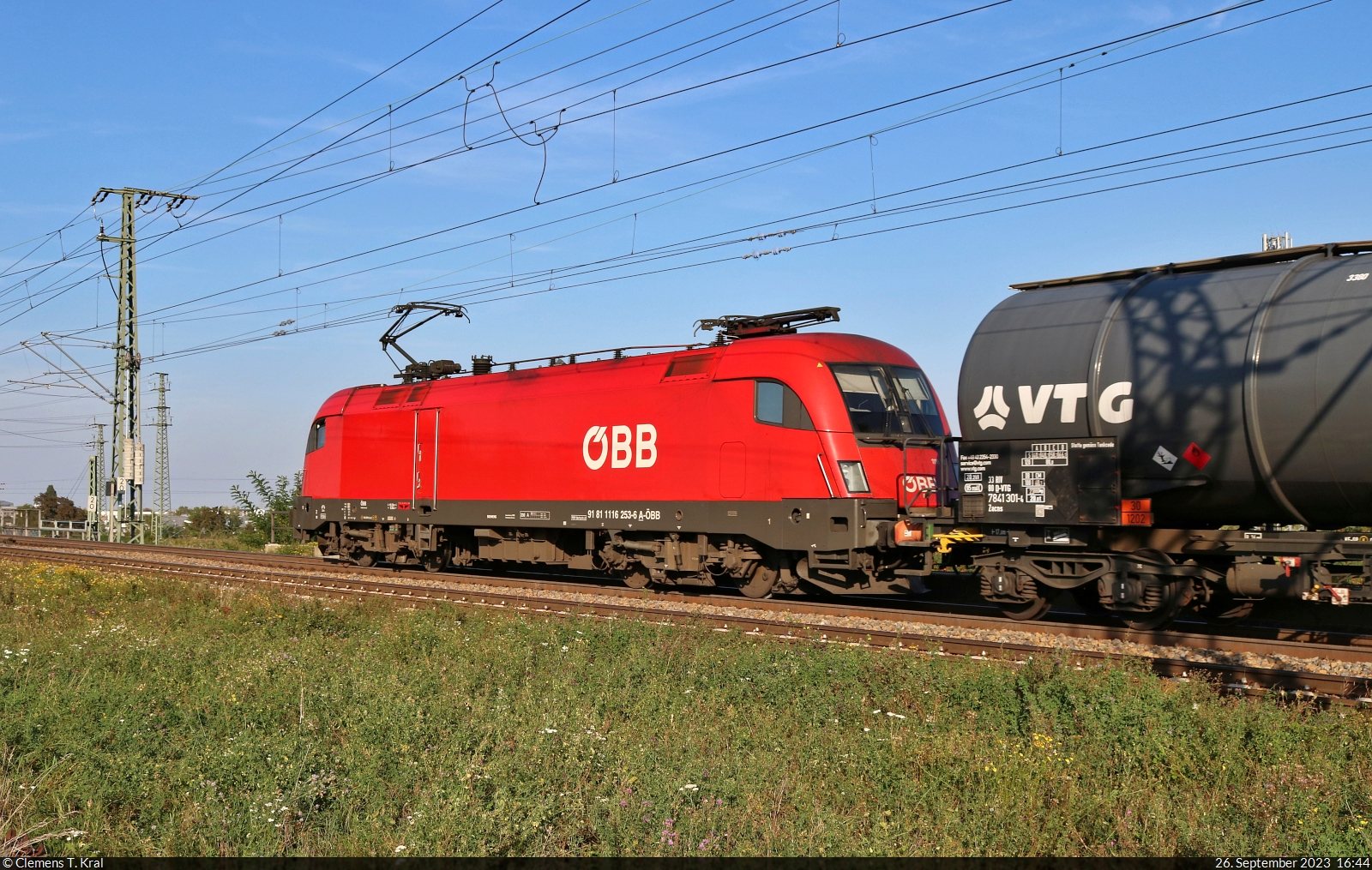 Seitlicher Schuss auf 1116 253-6 (Siemens ES64U2), die mit Kesselwagen über die Leipziger Chaussee (B 6) Richtung Zugbildungsanlage (ZBA) Halle (Saale) rollt.
