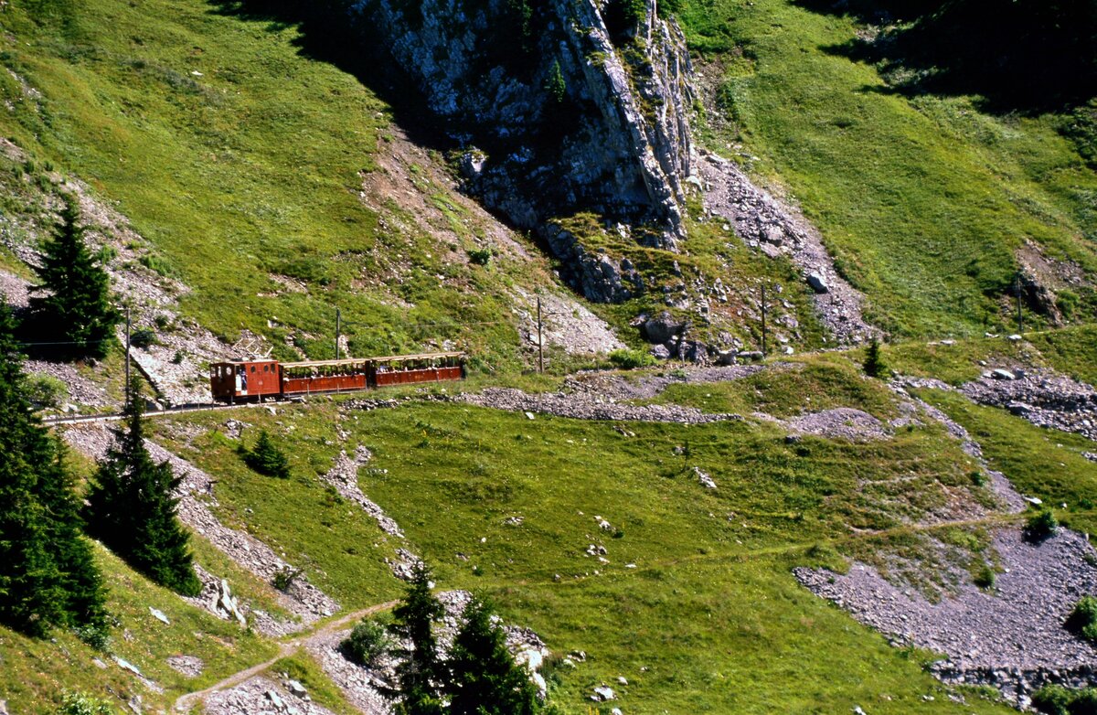 Schynige Platte-Bahn. Zahnradlok der Baureihe He 2/2 SPB