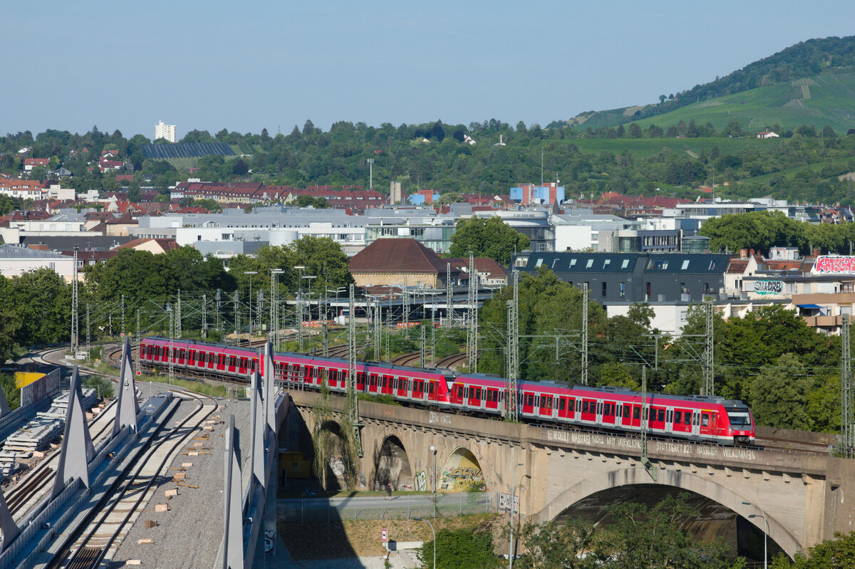 430-Langzug als S1 Kirchheim-Herrenberg am 16.07.2022 auf der Rosensteinbrücke in Stuttgart-Bad Cannstatt.