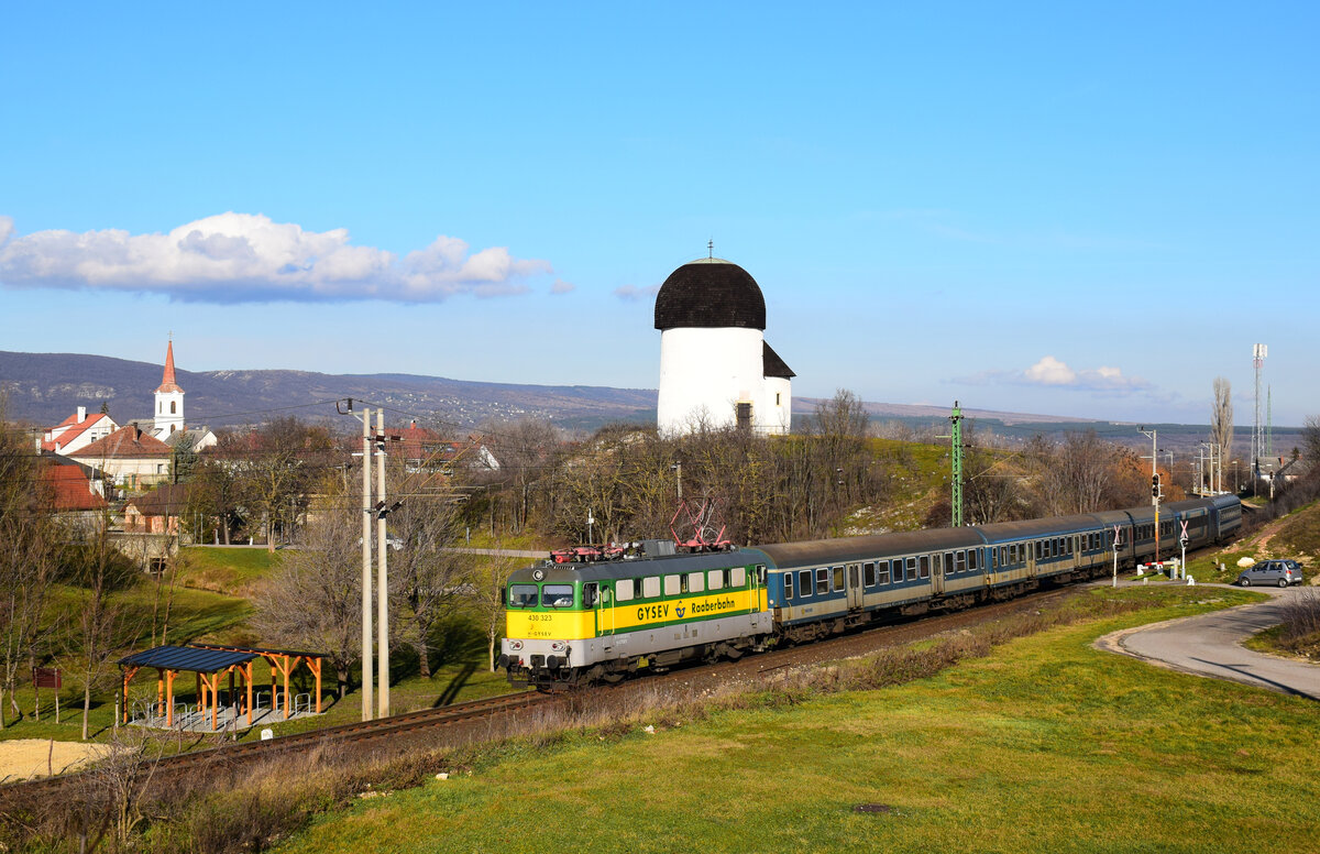 Es ist uns gelungen, in Bakony ein neues Motiv zu finden. Die GySEV 430 330 mit dem IC905 ist auf dem Weg von Szombathely nach Budapest Déli kurz nach der Abfahrt von dem Bahnhof Várpalota. Die Kirchen im Hintergrund gehören zu Inota (ist ein Ortsteil von Várpalota).