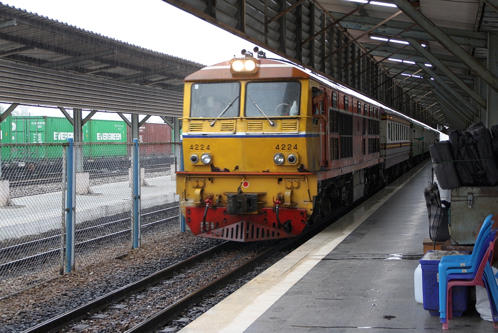 AHK 4224 (Co'Co', de, Krupp, Bj.1980, Fab.Nr. K-5486) fährt am 07.Jänner 2023 bei strömenden Regen mit dem LOC 463 (Phatthalung - Sungai Kolok) aus der Hat Yai Junction.