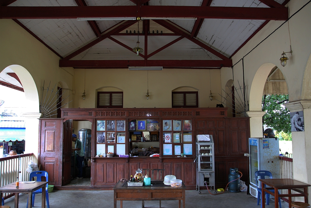 In der ehemaligen Songkhla Station befindet sich ein kleines Buffet. Bild vom 07.Jänner 2023. Von der 1978 eingestellten Bahnlinie Hat Yai - Songkhla ist das Aufnahmsgebäude der Songkhla Station noch erhalten und steht seit 2004 unter Denkmalschutz.