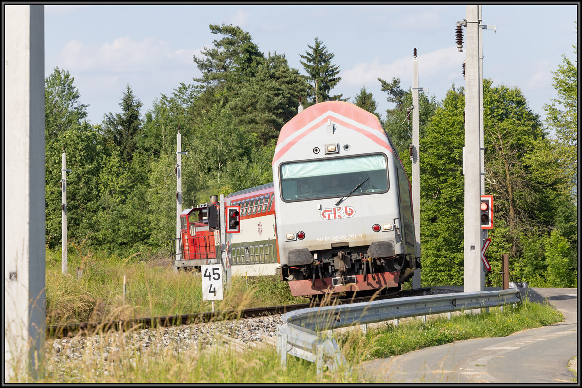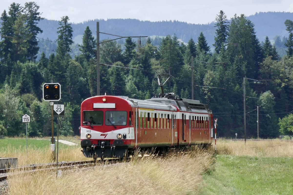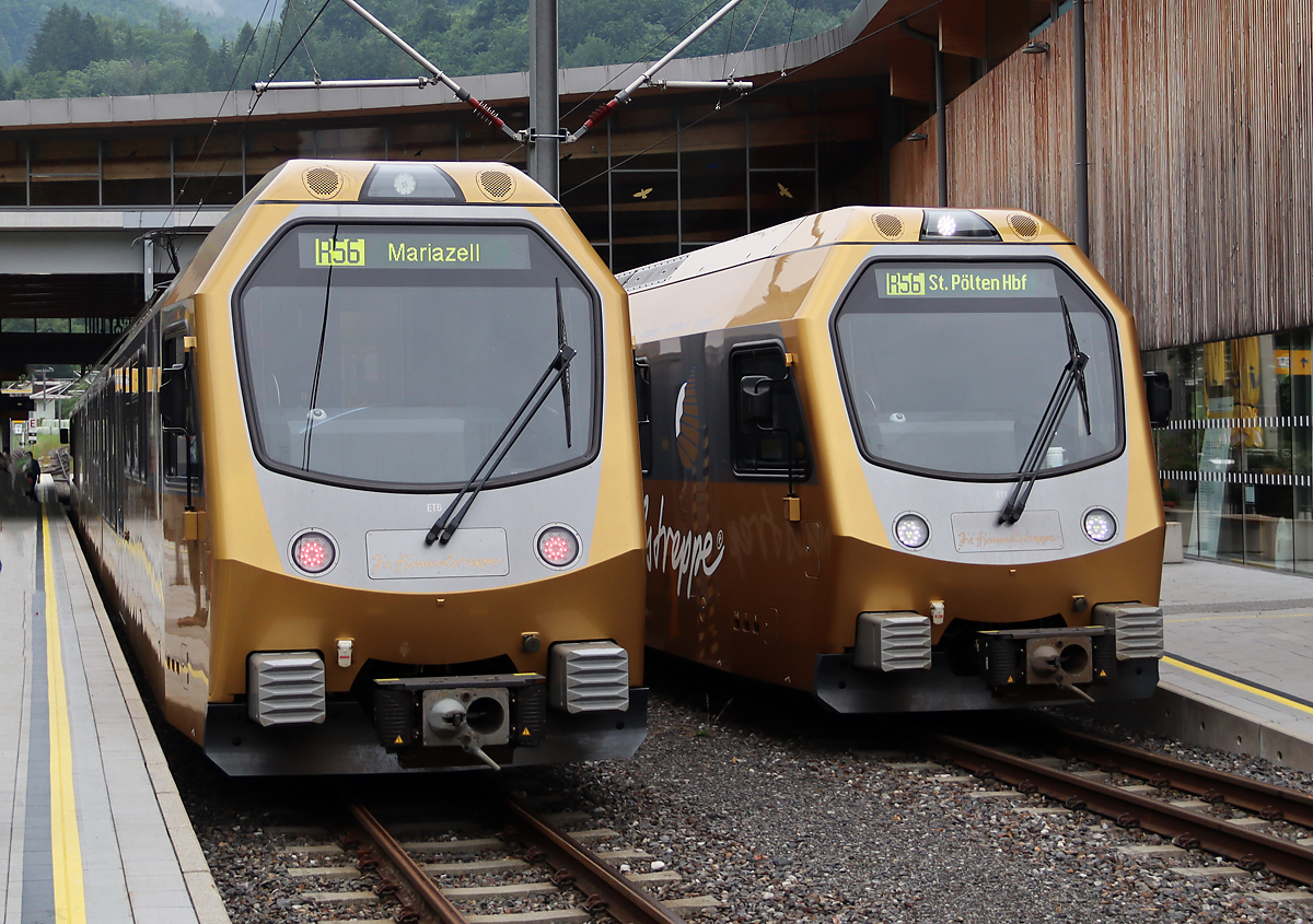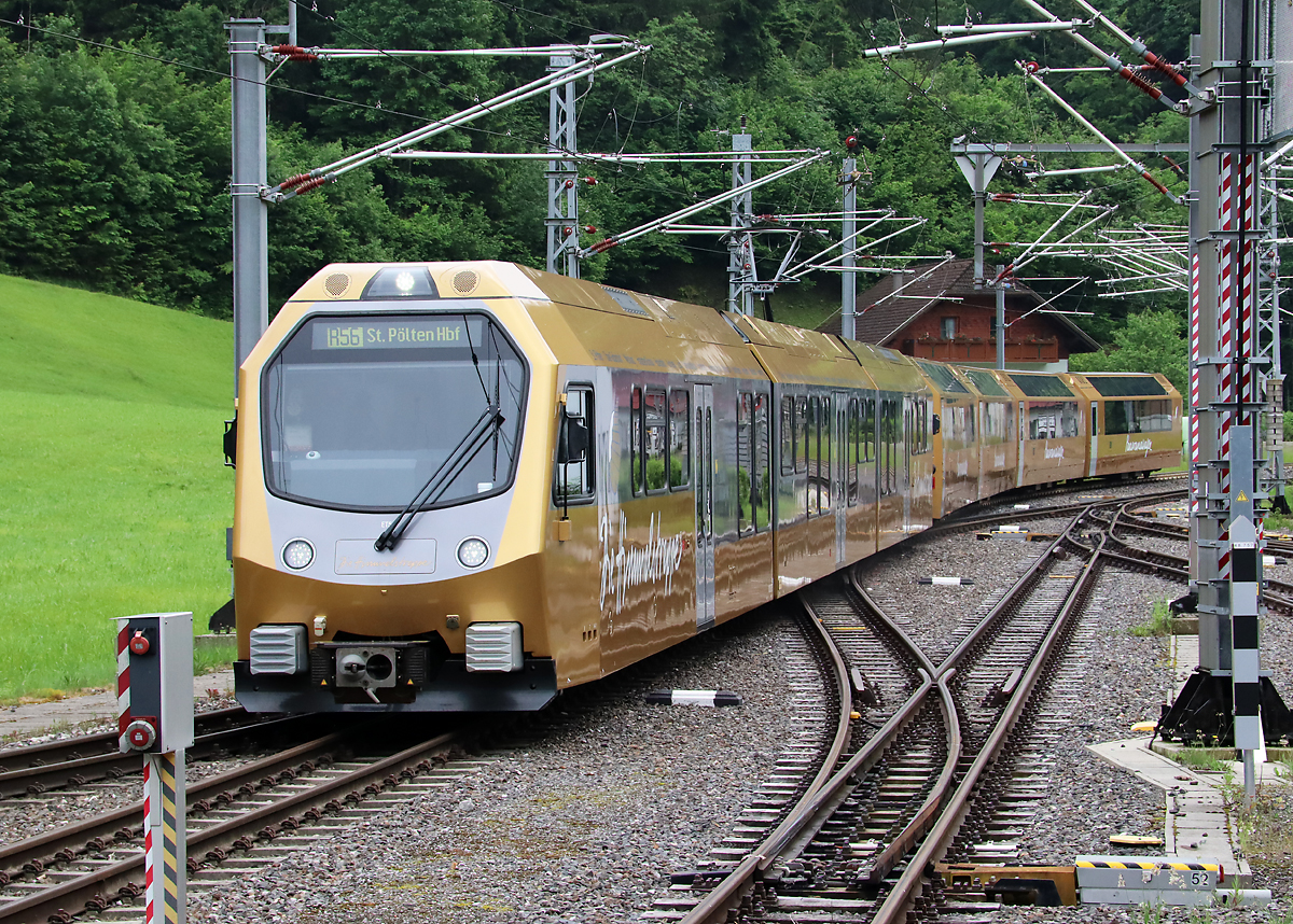 R56 von Mariazell nach St. Pölten Hbf fährt bei regnerischem Wetter in den Bahnhof Laubenbachmühle ein. Dieser Zug führt am Schluss vier Panoramawagen mit Speise- und Getränkeservice am Platz. Das Bild wurde vom Bahnsteig aus aufgenommen. Laubenbachmühle, 11.6.2023
