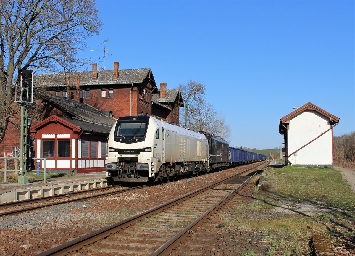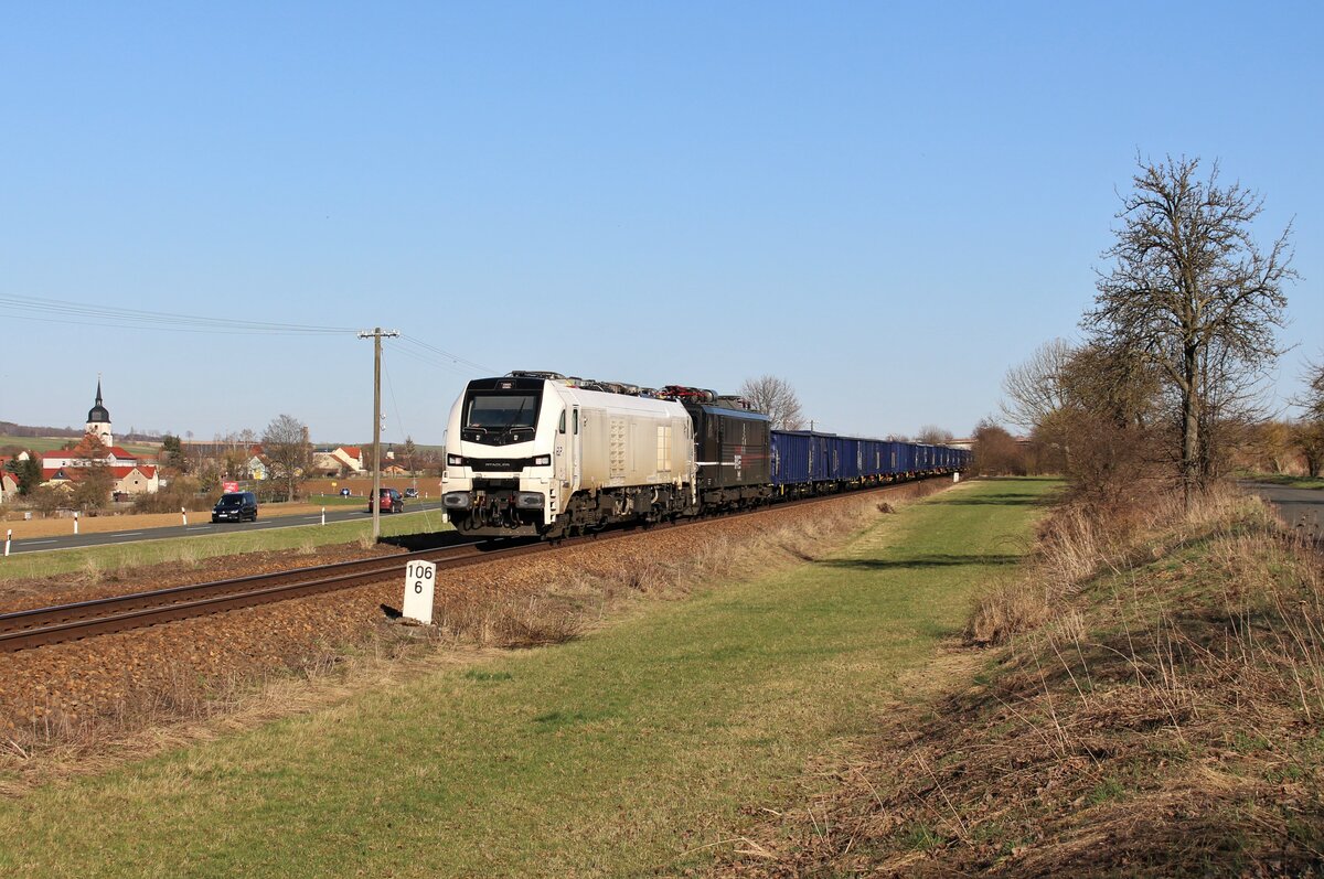 152 098 mit einem Güterzug am 14.04.2023 bei Lorch.