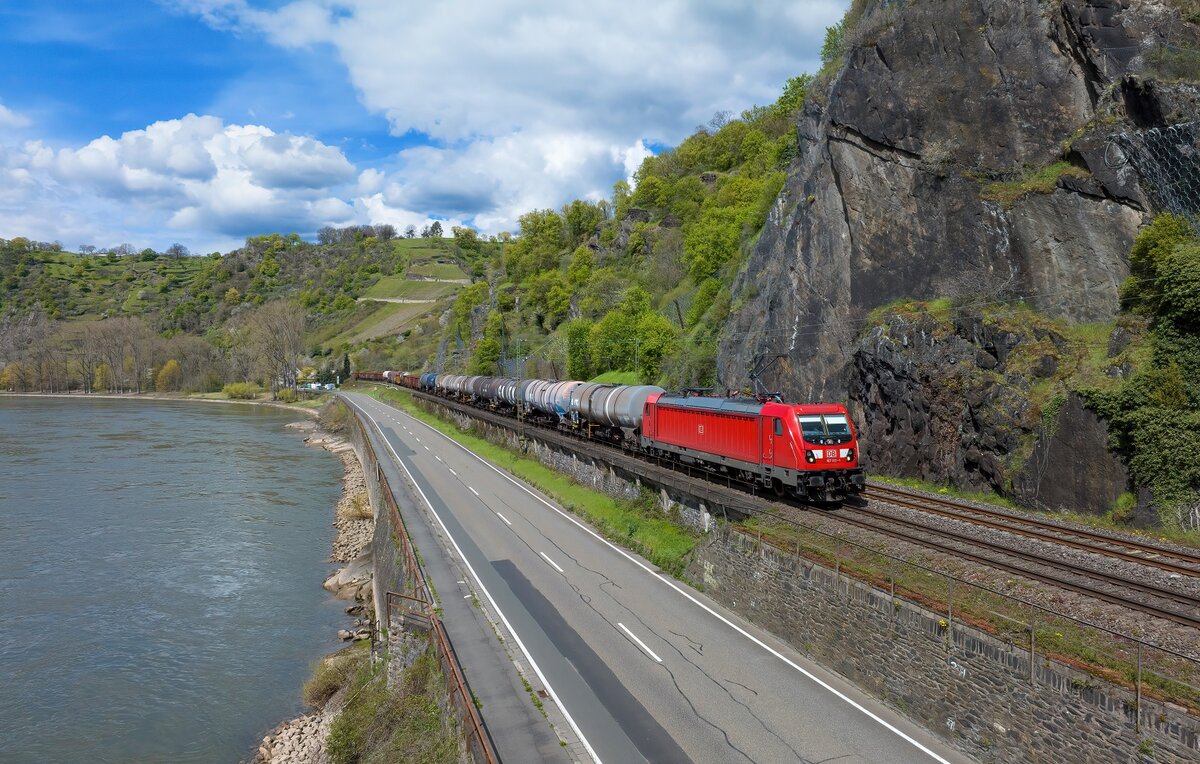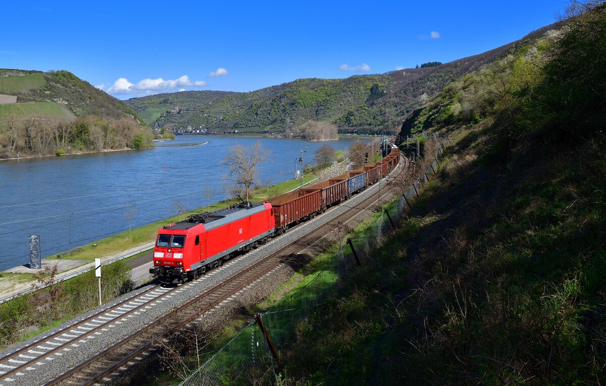 187 163 mit einem Güterzug am 14.04.2023 bei St. Goarshausen.