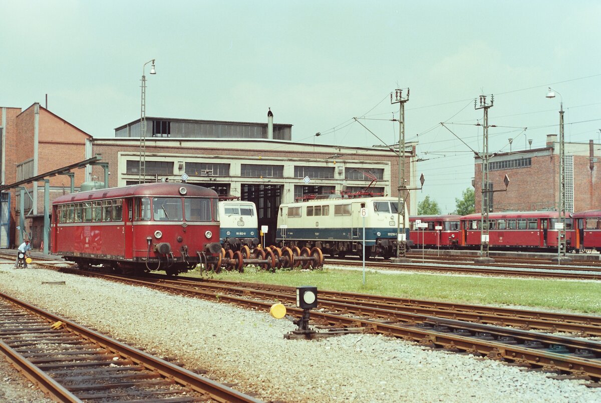 Bayerisches Bw Rosenheim (DB): Schneeräumer und Uerdinger Schienenbusse. Datum: 12.06.1984
