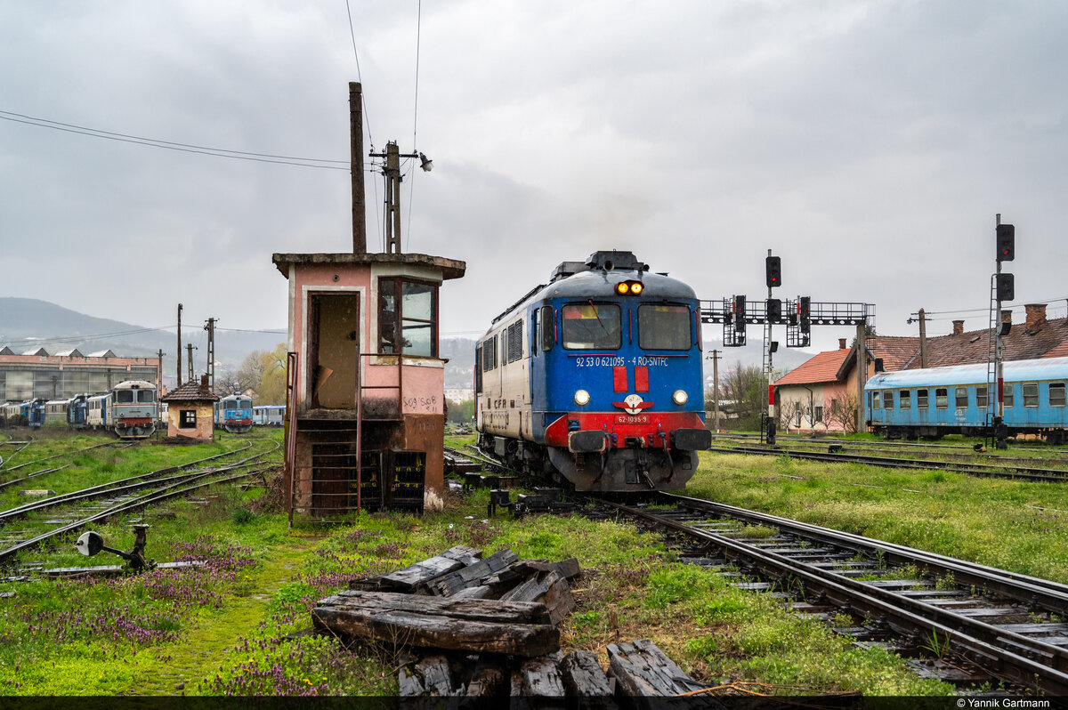 Am 14.04.2023 ist CFR Călători 62 1095 im Banhof von Jibou, Rumänien mit Rangieren beschäftigt und konnte hier neben einem alten Banhgebäude aufgenommen werden